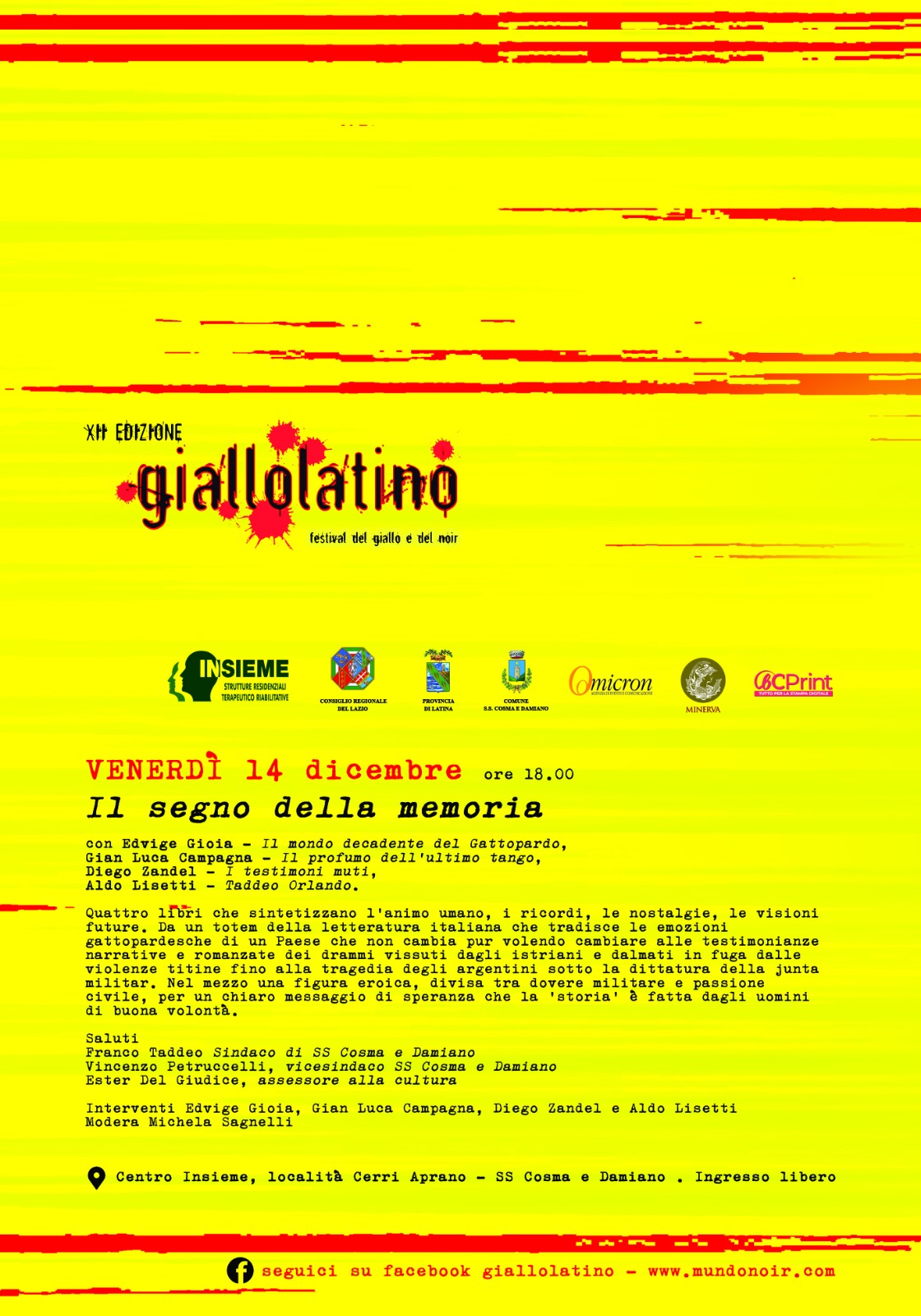 Quest’anno a farsene promotore è stata la Biblioteca Comunale di Santi Cosma e Damiano, ente capofila del progetto che ha coinvolto anche i comuni di Terracina e Monte San Biagio nella collaborazione con l’Agenzia Omicron e le varie realtà territoriali della provincia che da anni forniscono la propria collaborazione alla realizzazione di questo festival. La tappa prevista a Santi Cosma e Damiano è per venerdì 14 dicembre prossimo al mattino presso l’Istituto Comprensivo Rossi dove al mattino gli autori Giorgio Bastonini, Graziella Di Mambro e Gianluca Campagna incontreranno gli alunni per discutere dei libri di cui sono autori ed in particolare per Bastonini “Il quadro sulla parete di dolore”, la Di Mambro in “Tutte le bugie necessarie per essere felici”. Entrambe gli autori affronteranno la cronaca e gli altri avvenimenti attraverso spaccati di vita relativi alla terra pontina. Nel pomeriggio, invece appuntamento in grande aperto a tutti presso l’Auditorium della Comunità Insieme, in località Cerri Aprano, dove alle ore 18,00 l’incontro sarà “Nel segno della memoria”, incontro moderato da Michela Sagnelli che dopo i saluti di rito del Sindaco Franco Taddeo, del Vice Sindaco Vincenzo Petruccelli e dell’Assessore alla Cultura Ester Del Giudice, presenterà gli ospiti d’eccezione con le relative opere che saranno oggetto dell’incontro: la scrittrice Edvige Gioia con “Il mondo decadente del Gattopardo”, Gian Luca Campagna con “Il profumo dell’ultimo tango”, Diego Sandel con “I testimoni muti” ed Aldo Lisetti con “Taddeo Orlando”. I quattro autori sintetizzano nelle loro opere l’animo umano, i ricordi, le nostalgie e le visioni future. Da un totem delle letteratura italiana che tradisce le emozioni gattopardesche di un paese che non cambia pur volendo cambiare alla testimonianze narrative e romanzate dei drammi vissuti dagli istriani e dalmati in fuga dalle violenze titine fino alla tragedia degli argentini sotto la dittatura della giunta militare. Nel mezzo una figura eroica divisa tra dovere militare e passione civile per un chiaro messaggio di speranza che la storia è fatta dagli uomini di buona volontà.
