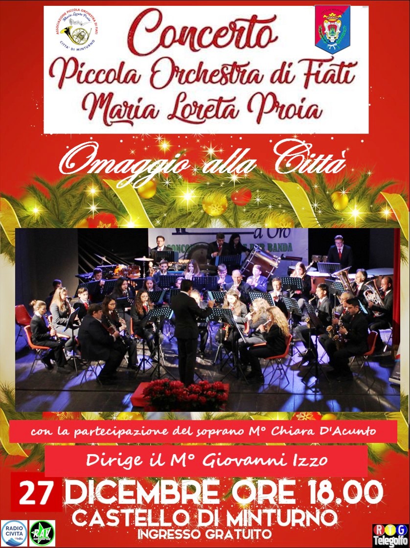 Venerdì 27 dicembre 2019, alle ore 18, presso il Castello Ducale di Minturno si svolgerà il tradizionale concerto del periodo natalizio tenuto dalla banda di interesse comunale “Piccola Orchestra di Fiati Maria Loreta Proia”. Sarà un omaggio musicale a tutta la città di Minturno, per il tramite del Consiglio comunale e dell’Amministrazione civica. L’orchestra sarà accompagnata dalla soprano Maestro Chiara D’Acunto, il concerto sarà diretto dal Maestro Giovanni Izzo, presenterà la prof.ssa Emilia Alicandro. La cittadinanza è invitata a partecipare. Ingresso gratuito. Il concerto sarà occasione per uno scambio di auguri del Consiglio comunale e dell’Amministrazione civica per un anno 2020 proficuo di attività svolte in armonia e concordia tra tutti: Amministratori e cittadini; con il saluto in omaggio alla Città, l’ensemble musicale vuole essere portatore di buon auspicio di accordo tra le parti nel prioritario interesse della collettività. Il concerto avrà un repertorio vario, che parte da brani originali per orchestra di fiati, per dare poi spazio a brani classici del repertorio operistico, con l’intervento della soprano Chiara D’Acunto; infatti ritorna, dopo il successo di un anno fa, la cantante lirica minturnese, impegnata nel panorama internazionale della musica lirica, la quale, con la sua partecipazione straordinaria e accompagnata dai ragazzi della Banda di Minturno, di nuovo farà dono della sua splendida voce alla sua Città. Il concerto terminerà con gli auguri al Consiglio comunale ed all’Amministrazione civica per avviare le attività consigliari ed amministrative della città di Minturno per il 2020 nel modo più armonioso possibile, al fine di svolgere un proficuo lavoro in “sintonia e accordo”, ben rappresentati dalla eufonia raggiunta tra i diversi strumenti di un’orchestra: Il progresso di una comunità di cittadini passa per l’armonizzazione delle diverse idee e proposte da parte di tutti coloro che sono responsabili e hanno ruoli chiave nelle funzioni della Città, ma quello stesso progresso necessita che tutti siano “sintonizzati e accordati” sulla stessa nota concordata per il bene della collettività, nella bellezza dell’eufonia. Il presidente dell’associazione, il col. D’Agostino, auspica che la cittadinanza possa apprezzare il livello qualitativo raggiunto dai bandisti, e iscriversi o iscrivere i propri figli alla banda dove, dietro un esiguo pagamento, sono assicurate lezioni di solfeggio e di strumento individuale e di gruppo, infatti, è in corso una visibile campagna di adesione, necessaria per garantire un adeguato turn-over per quei musicanti ora cresciuti e non più in grado di assicurare la loro presenza poiché impegnati all’università o per lavoro. È possibile iscriversi a tutte le età, e al momento sono disponibili 35 strumenti a fiato tra sassofoni, flicorni, trombe, tromboni, clarinetti e quant’altro, assieme a tutta la serie di percussioni dalla grancassa alla batteria e al glockenspiel, che saranno assegnati ai primi richiedenti. Per info 3385075087 oppure banda.mlp-minturno@libero.it. L’evento del 27 dicembre 2019 ha il patrocinio del comune di Minturno. Media partner: Radio Civita inBlu, RAV (Radio Antenna Verde) e Telegolfo 810.