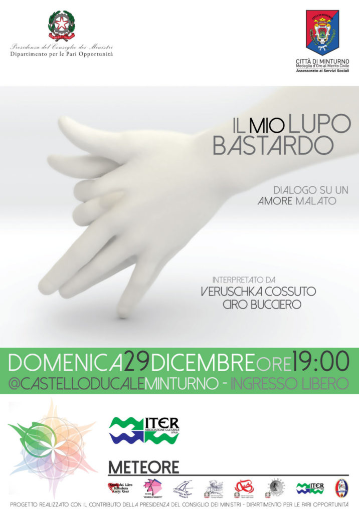 Domenica 29 dicembre, alle ore 19, nel Castello Baronale di Minturno andrà in scena “IL MIO LUPO BASTARDO, dialoghi su un amore malato” un progetto realizzato con il contributo della Presidenza del Consiglio dei Ministri- dipartimento Per le Pari Opportunità e Patrocinato dal Comune di Minturno. Ad interpretare i dialoghi Verushka Cossuto e Ciro Bucciero. Ingresso libero.