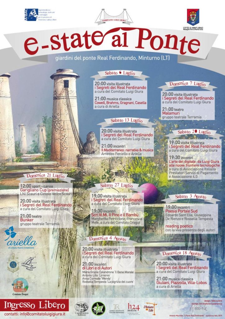 Frosinone, Latina e Rieti e il Comune di Minturno. Il cartellone prevede una ricca serie di iniziative tra cui concerti di musica classica, rappresentazioni teatrali, presentazioni di libri, eventi sportivi, letture di poesie, incontri culturali. Ogni evento sarà preceduto da una visita illustrata del Ponte Real Ferdinando a cura del Comitato Luigi Giura. Si comincia sabato 6 luglio con un concerto di musica classica con brani di Cowell, Brahms, Gragnani e Casella a cura dell’Associazione Culturale “Ariella” di Cellole. La manifestazione, a ingresso gratuito, si svolgerà tutti i sabato e la prima e terza domenica del mese fino al 18 agosto 2019. La visita illustrata inizierà alle ore 20,00, l’evento alle ore 21,00. Nelle serate di sabato 20 luglio e sabato 27 luglio gli eventi avranno inizio alle ore 19,30, domenica 3 agosto alle ore 19,00, così da consentire al pubblico di proseguire la serata culturale al Teatro Romano.