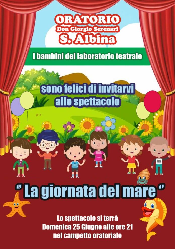 Domani domenica 25 giugno alle ore 21.00 nel campetto oratoriale della Chiesa di Santa Albina dedicato al sacerdote don Giorgio Serenari gli animatori hanno preparato i bambini dell’Oratorio a una rappresentazione teatrale dal titolo “La giornata del mare”. I mini attori del Laboratorio Teatrale hanno dimostrato doti e valori individuali e di gruppo. Domenica sera sarà senz’altro una piacevole serata. Il parroco don Antonio Cairo ha creduto nel progetto sin dal primo giorno e lo ha costantemente incoraggiato.