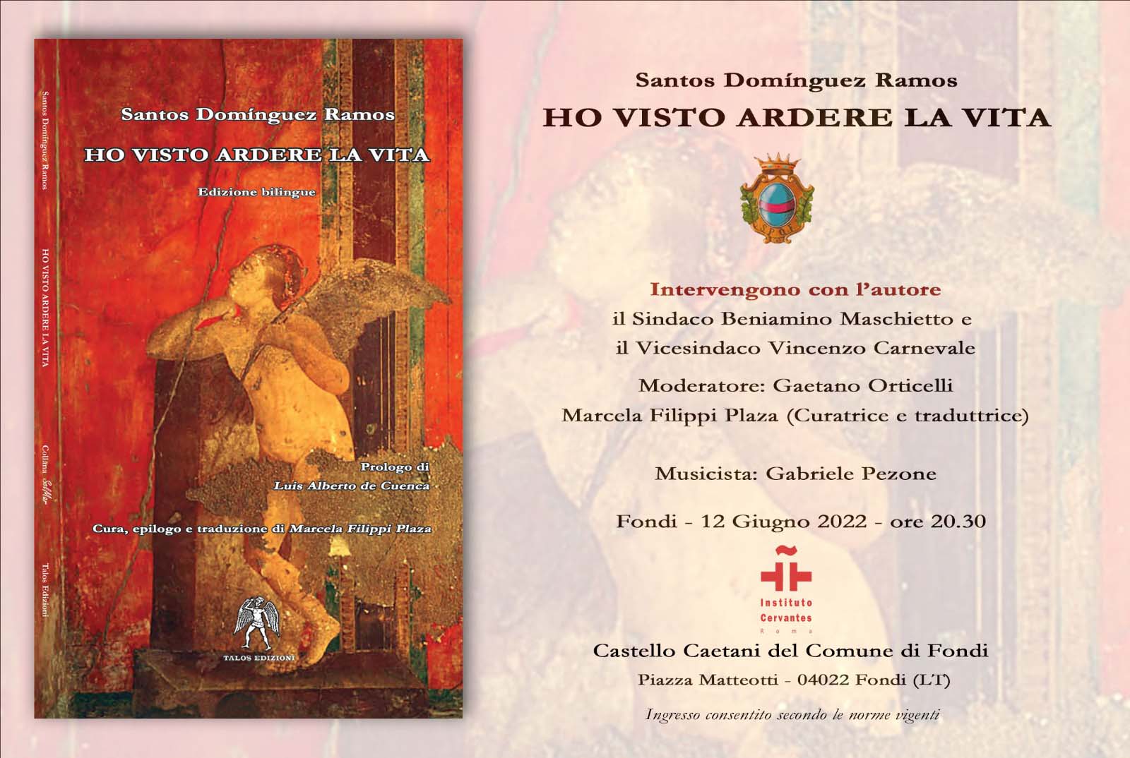 “Ho visto ardere la vita”. Sul terrazzo del Castello Caetani di Fondi la presentazione del libro. Domenica 12 giugno 2022 alle ore 20,30, uno dei più grandi poeti viventi spagnoli, Santos Domínguez Ramos sarà presente a Fondi per presentare il suo libro di poesie bilingue, che sarà donato a tutte le persone presenti all’evento. Interverranno con l’autore il Sindaco Beniamino Maschietto e il Vicesindaco Vincenzo Carnevale; Marcela Filippi Plaza (Curatrice e traduttrice). A moderatore l’evento: Gaetano Orticelli. Le musiche saranno eseguite dal musicista Gabriele Pezone. Ingresso libero e consentito secondo le norme vigenti anticovid. Il poeta donerà il libro a tutte le persone presenti alla serata. “Il poeta spagnolo Santos Domínguez Ramos (nato a Cáceres nel1955) riunisce in questa edizione bilingue quattordici poesie, per lo più ecfrastiche, in cui rende il suo speciale tributo di ammirazione all’Italia e alla sua cultura in versi pieni di saggezza e di emozione. Marcela Filippi ha curato la traduzione in un italiano tanto elegante quanto fedele all’originale.” (Luis Alberto de Cuenca). Nel ricco panorama della poesia spagnola degli ultimi decenni, si sottolinea il nome di Santos Domínguez Ramos, autore spagnolo la cui opera è stata ampiamente riconosciuta, premiata, tradotta e inclusa nella selezione 25 poètes d’Espagne, pubblicata in Francia nel 2008, considerata come una delle più rappresentative della poesia spagnola degli ultimi cinquant’anni. È autore di altri libri eccellenti: Las provincias del frío, En un bosque extranjero, Las sílabas del tiempo, Luna y ciencia nocturna, El viento sobre el agua, Principio de Incertidumbre, Regulaciòn del sueño, Un canto straniero (Talos Edizioni,2019), El tercer reino (Pre-Textos, Poesía.Valencia 2021), Ho visto ardere la vita (Talos Edizioni, 2021). Una delle sue opere “El viento sobre el agua” , ha ottenuto all’unanimità il XXXVI Premio Ispanoamericano di Poesia Juan Ramòn Jìmenez, uno tra i più importanti che si concede nella lingua spagnola. La sua opera poetica viene considerata come “una delle voci più importanti e più autentiche della sua generazione, che coniuga perfettamente i due principali ingredienti poetici:l’esattezza e il mistero” (Felix Grande). La critica specializzata lo considera uno dei principali poeti spagnoli dell’attualità.