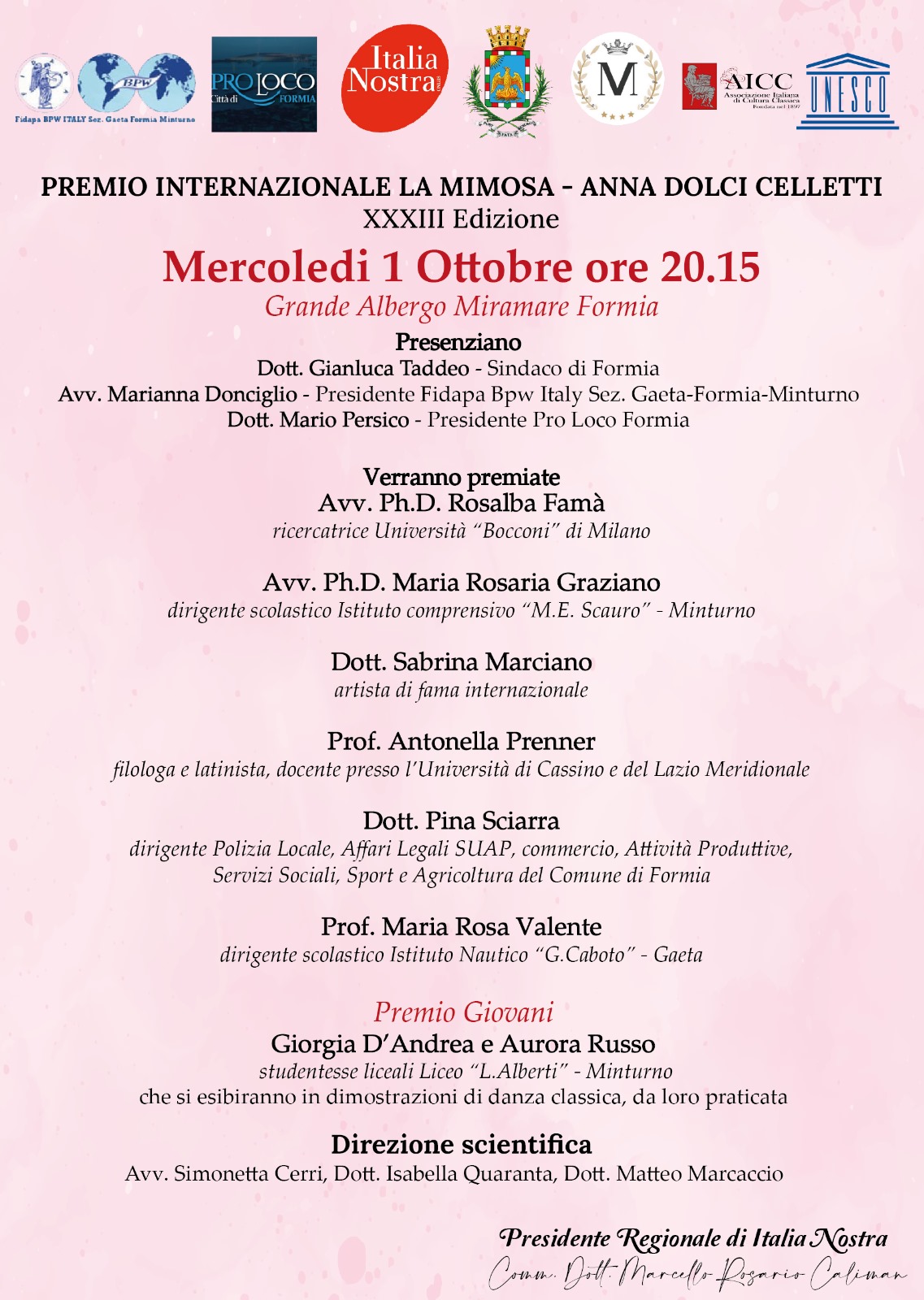 Italia Nostra – La direzione scientifica del Premio Italia Nostra “La Mimosa – Anna Dolci Celletti” è composta da: Simonetta Cerri; Anna D’Alessandro; Alessandra Forcina; Matteo Marcaccio; Isabella Quaranta; Grazia Sotis. Coordinatore della premiazione sin dalla sua istituzione é il presidente di Italia Nostra del Consiglio Regionale del Lazio e della sezione Golfo di Gaeta, Marcello Rosario Caliman nonché presidente della AICC – Unesco delegazione di Gaeta. La premiazione si aprirà con i saluti del Sindaco di Formia Gianluca Taddeo, della Presidente Fidapa, Marianna Donciglio, e del Presidente della Pro Loco città di Formia, Mario Persico. A ingresso libero. La locandina è valevole come invito.