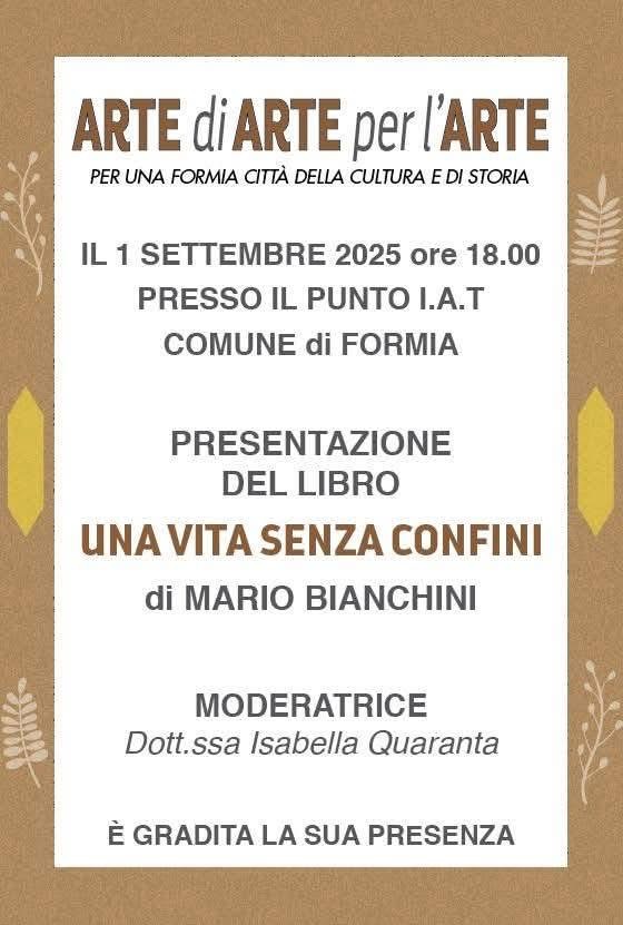 Mario Bianchini – Lunedì primo settembre, alle ore 18:00, presso il Punto IAT del Palazzo Comunale in Formia, si terrà la presentazione del libro di Mario Bianchini “Una vita senza confini”. Un libro scorrevole fatto di narrazioni, aneddoti, poesie e considerazioni. Mario Bianchini che si definisce “un villano della Cultura” rivela nelle pagine di questo libro un significativo spessore umano, una particolare sensibilità sociale e un intuito fuori dal comune verso le situazioni della vita che spesso una Laurea non può far acquisire. Solo la palestra della vita, vissuta intensamente, sviluppa e potenzia certe qualità. Il contatto assiduo con gli altri e con chi spesso é in difficoltà rende capaci di apprezzare ogni cosa che si ha, a non basare tutto sulla prima impressione ma andare sempre oltre ciò che si vede per lasciare che sia la percezione del proprio cuore a capire e decidere. Questo incontro chiude il progetto culturale “Arte di Arte per l’Arte” ideato e coordinato dallo stesso Mario Bianchini che ha visto tanti artisti esporre le proprie opere pittoriche nel corso del mese di agosto, vivacizzando il Punto IAT: Tommaso Ciufo, Mena Meschino, Alfredo Lagni, Dino Di Pinto, Angelo Russo, Gianni Di Nucci, Maria Pia Ricciardi, Roberta Antetomaso, a cui si sono uniti in esposizione i manufatti artigianali dei ragazzi dell’Happy Bar nonché il ricercato concerto del Maestro Lello Traisci nel rione Castellone lo scorso 10 agosto. Nello stesso Punto IAT proseguiranno le attività artistiche in collaborazione con l’Associazione culturale KOINE’ di Formia, col patrocinio del Comune e della Pro Loco. Durante la presentazione del libro di Mario Bianchini, fra dialoghi e narrazioni ci saranno intervalli di Miriam Masciandaro che, con la chitarra, intonerà alcune canzoni e Francesco Treglia che leggerà e declamerà alcune sue poesie. Presterà la sua voce per le letture dell’autore Eleonora Quaranta. Un incontro tra Amici, aperto a tutti e la locandina (sotto a dx) è valevole come invito.