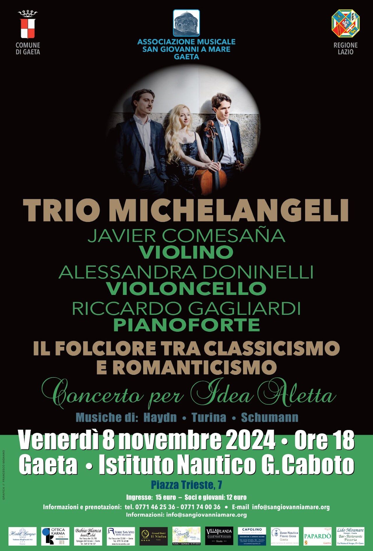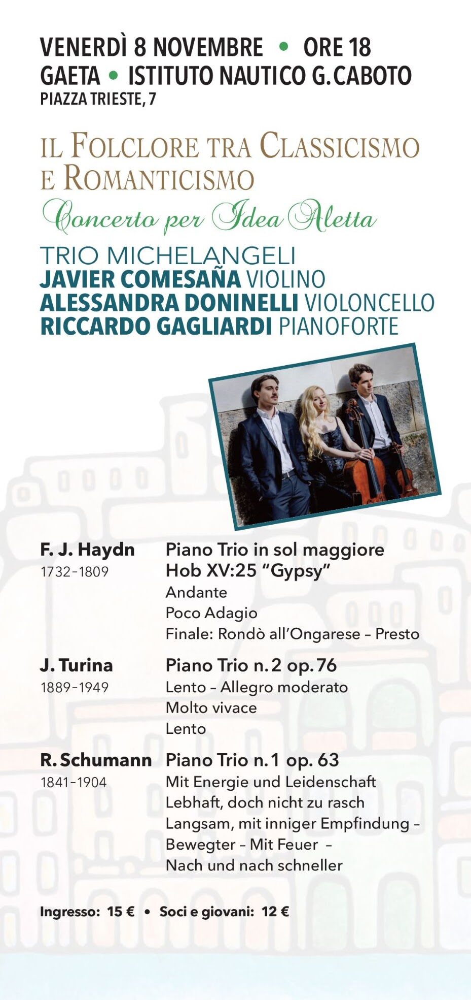 Concerto in memoria di Idea Aletta – La tradizione è continuata con la presidenza della professoressa Vera Liguori Mignano che non si è risparmiata, lungo il corso degli anni, nel mantenere alto il livello di proposte musicali della Associazione manifestando una grande apertura anche a generi musicali più vicini ai nostri tempi come ad esempio il jazz, la musica del repertorio classico napoletano ed altri generi moderni che attraggono tanti appassionati di musica sempre ad alto livello. In questa occasione si esibirà il TRIO MICHELANGELI IL FOLCLORE TRA CLASSICISMO E ROMANTICISMO. Si pubblicano le locandine per offrire un quadro chiaro dell’appuntamento musicale da non perdere. Per chi desiderasse sarà possibile l’iscrizione all’Associazione.