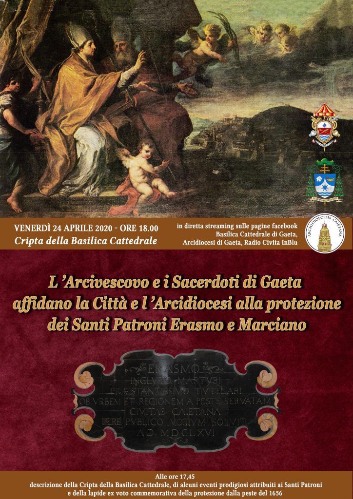 “Venerdì 24 aprile alle ore 18.00, l’Arcivescovo S.E. Mons. Luigi Vari presiederà la celebrazione dell’Eucaristia con i sacerdoti di Gaeta, nella quale affiderà la Città e l’Arcidiocesi alla protezione dei Santi Patroni Erasmo e Marciano. All’indomani della Pasqua, l’Arcivescovo ha espresso il desiderio di recarsi in pellegrinaggio ai tanti luoghi della fede e della devozione che la Chiesa di Gaeta custodisce, per consegnare al patrocinio della Madonna e dei Santi il popolo di Dio affidato alle sue cure pastorali in questo tempo particolare di emergenza a causa della pandemia del coronavirus.
