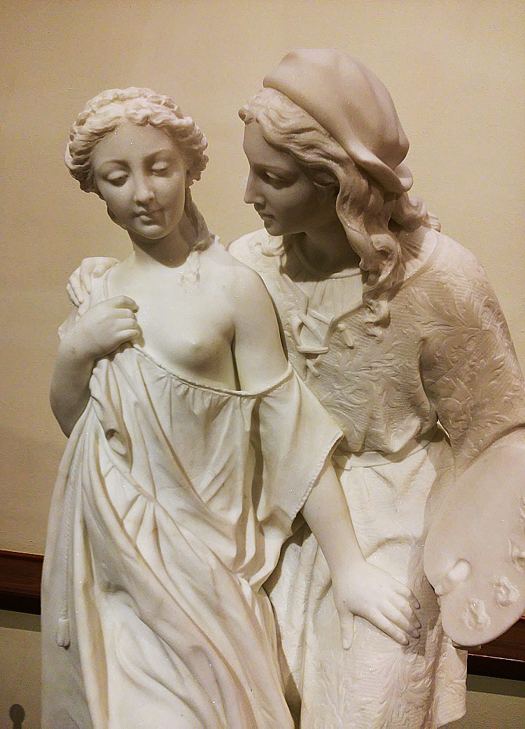 La posa delle mani, una appoggiata sul grembo, l’altra su un seno, rimanda alla Venere pudica della statuaria classica: la donna si copre con un velo trasparente in un gesto pudico, anche se l’occhio dell’osservatore è orientato verso ciò che la figura vorrebbe sottrarre alla vista. I capelli neri appaiono raccolti in un lungo drappo oro e blu annodato sulla nuca e impreziosito da una perlina che le orna il capo. Il viso è regolare con grandi occhi scuri, la bocca piuttosto carnosa e le gote leggermente arrossate. La perla, presente sia nella Fornarina che nella Velata, rimanderebbe al nome stesso della ragazza: Margherita deriva infatti dal termine greco margaritès che significa “perla, gemma”, anche se nel Medioevo ha assunto l’accezione abituale di elemento botanico. Perciò il piccolo ornamento sul capo sarebbe un ulteriore omaggio alla bella Margherita Luti. Il braccio sinistro della fanciulla è cinto da uno stretto bracciale blu e oro che reca la scritta “Raphael Urbinas”, firma dell’artista e vincolo amoroso. Sullo sfondo si notano un cespuglio di mirto e un ramo di melo cotogno, simboli di fertilità e di amore e simboli della dea Venere. Il ritratto è impregnato “di carnalità e sospensione, realtà terrena e carattere sfuggente, superiorità e condiscendenza per mezzo di una plastica dolce ma precisa e solida, carezzevole nell’armonico risuonare dei caldi valori cromatici”: così lo aveva definito lo storico dell’arte Nello Ponente. Poche certezze dunque e molto mistero sulla donna dagli occhi profondi che la critica vorrebbe riapparire in altri celebri quadri di Raffaello, dalla Velata al Trionfo di Galatea fino alla Madonna Sistina. A lei, che da secoli tenta di nascondere senza troppa convinzione le sue nudità, anche la letteratura e il teatro si sono ispirati, a tal riguardo pubblichiamo alcuni dipinti ispirati al loro amore idealizzato.