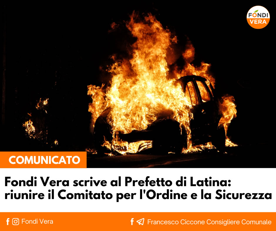 Il Movimento di Partecipazione Politica Fondi Vera, con una nota inviata al Prefetto di Latina Dott. Maurizio Falco e per conoscenza al Sindaco di Fondi Dott. Beniamino Maschietto, ha chiesto ufficialmente la convocazione, con cortese urgenza, del Comitato Provinciale per l’Ordine e la Sicurezza Pubblica. Tale richiesta deriva dagli accadimenti, verificatisi nell’arco di pochi giorni, sul territorio del Comune di Fondi, con dinamiche apparentemente speculari. Tali episodi passano da incendi a danno di alcune autovetture fino a veri e propri attentati dinamitardi ad abitazioni private.