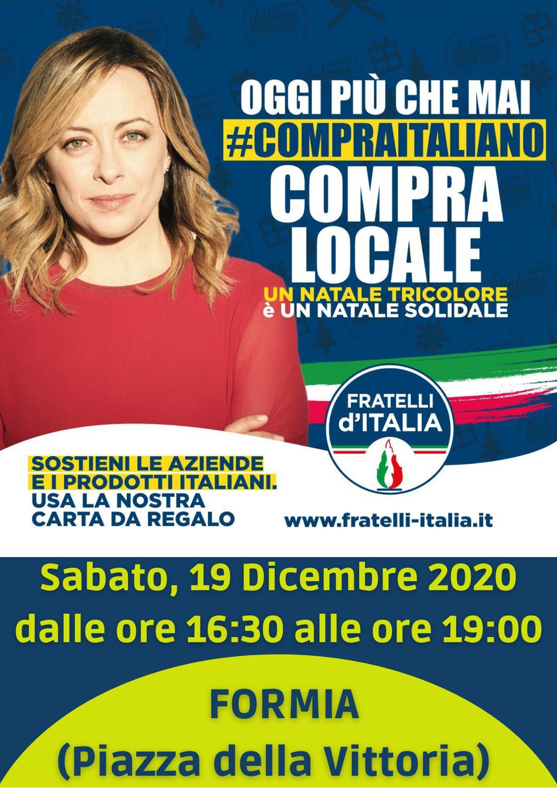 In occasione del Natale il Partito di Giorgia Meloni organizza gazebo nei quali chiunque avrà acquistato un prodotto fatto in Italia e comprato in un negozio di vicinato potrà impacchettarlo, grazie all’impegno dei nostri volontari, con una inedita carta da regalo che riporta il logo della campagna “compra italiano, compra locale. Un Natale tricolore è un Natale solidale”