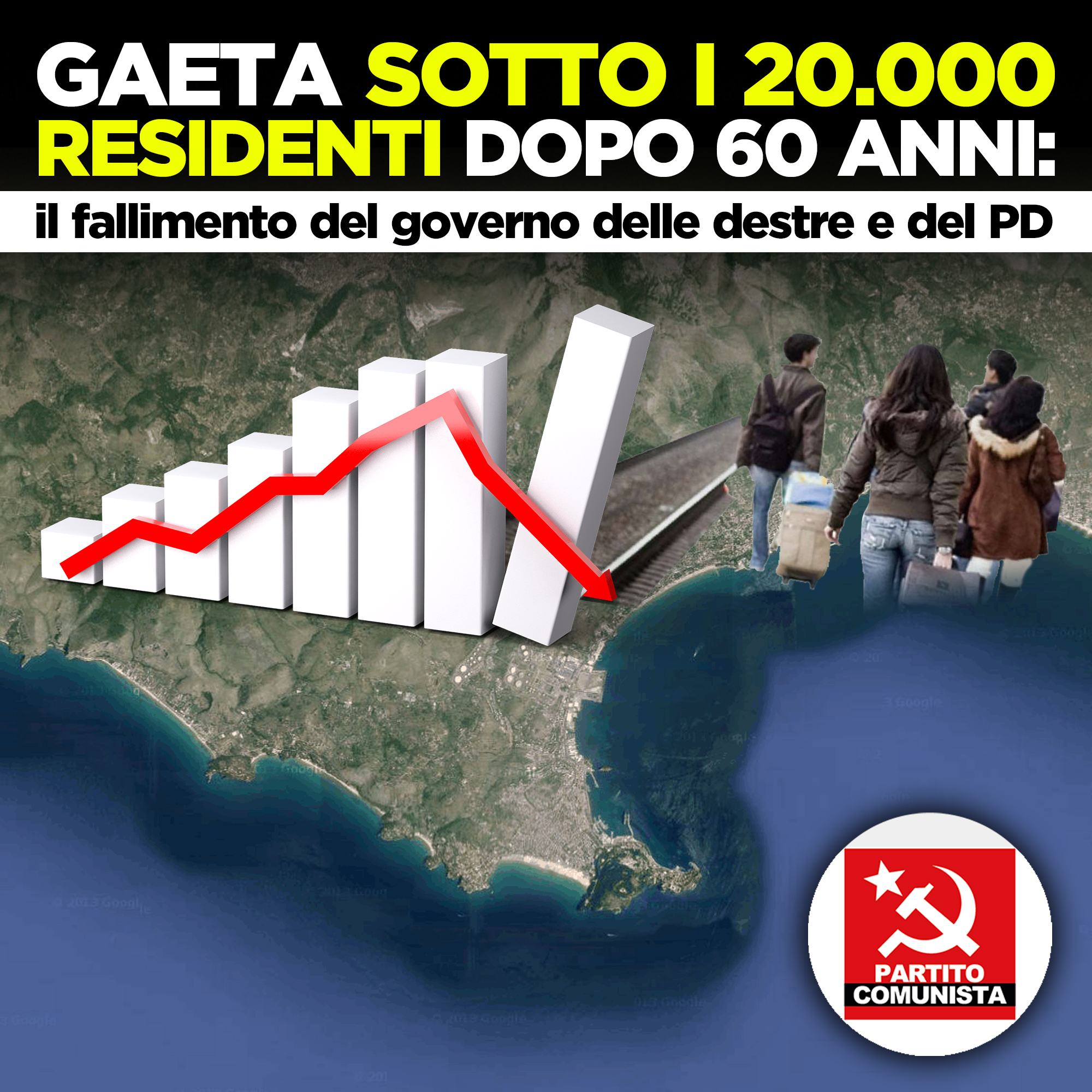 Il Partito Comunista di Gaeta Sez.”Mariano Mandolesi” comunica: “I dati demografici che riguardano Gaeta certificano, al di là di ogni ragionevole dubbio, il completo fallimento del governo cittadino delle destre con il Partito Democratico e di 9 anni di Giunta Mitrano. Ad Agosto del 2020 i dati Istat attestano 19.912 residenti. Qualora il dato venisse confermato anche al 31/12, come probabilmente accadrà, sarebbe la prima volta da almeno 60 anni che il saldo annuale vede la popolazione cittadina scendere sotto i 20 mila abitanti. Se si considera che, diversamente dal dopoguerra, oggi molte di queste residenze sono fittizie poiché mantenute per conservare piccoli benefici sulle seconde case, si comprende ancor meglio quanto questo dato sia allarmante. Il saldo naturale del rapporto tra le nascite e i decessi si è mantenuto costantemente negativo dal 2012 ad oggi, aumentando notevolmente rispetto al decennio precedente e raggiungendo delle punte mai registrate prima. Anche il saldo migratorio risulta negativo a partire dal 2016. L’età media della popolazione si è invece incrementata costantemente passando dai 45,9 anni del 2012 ai 48,4 degli ultimi dati disponibili, con un decremento costante e impetuoso della popolazione con età da 0 a 14 anni e da 15 a 64 anni a partire dal 2014.