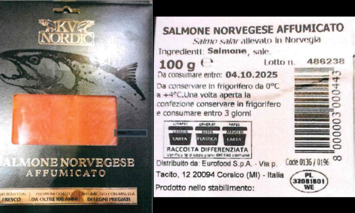 Presenza di Listeria nel Salmone. Nuovo richiamo alimentare dal Ministero della Salute – Nuovo richiamo alimentare per rischio MICROBIOLOGICO sul sito del Ministero della Salute in data 12/09/2025 e riguarda il prodotto SALMONE. Denominazione di vendita: SALMONE NORVEGESE AFFUMICATO, Marchio del prodotto: KV NORDIC, Nome o ragione sociale dell’OSA a nome del quale il prodotto è commercializzato: EUROFOOD SPA. Lotto di Produzione: 486238, data di scadenza o termine minimo di conservazione: 04/10/2025, Descrizione peso/volume unità di vendita: 100gr, Nome del produttore: KORAL SA. Marchio di identificazione dello stabilimento/del produttore: PL 32081801, Sede dello stabilimento: POLONIA. Motivo del richiamo: