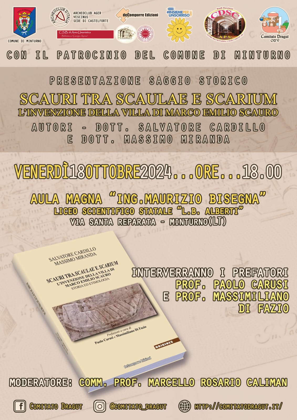 Scauri tra Scaulae e Scarium – Venerdì 18 ottobre alle ore 18:00 presso l’aula magna “Ing. Maurizio Bisegna” del liceo scientifico di Minturno “Leon Battista Alberti”, ci sarà la presentazione del volume “Scauri tra Scaulae e Scarium” scritto dagli autori, i dottori Salvatore Cardillo e Massimo Miranda. I prefatori saranno: il professor Paolo Carusi dell’Università degli Studi Roma Tre e professor Massimiliano Di Fazio dell’Università degli Studi di Pavia. Modera il commendator professor Marcello Rosario Caliman, presidente di Italia Nostra APS sezione Golfo e Consiglio Regionale Italia Nostra Lazio. Il testo inquadra l’etimologia scaurese nell’ampio bacino dei toponimi similari del Mediterraneo, offrendo nuove piccole curiosità storiche sul borgo del Tirreno. Ingresso libero. Da non perdere per chi ama approfondire il rapporto con le radici territoriali.