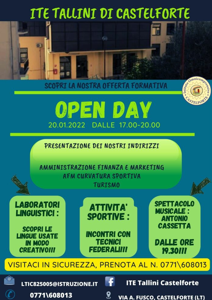 Il dirigente scolastico Amato Polidoro con due locandine presenta la giornata di giovedì 20 gennaio 2022 che si presenta al Tallini di Castelforte con tutte le sue potenzialità e l’offerta formativa.