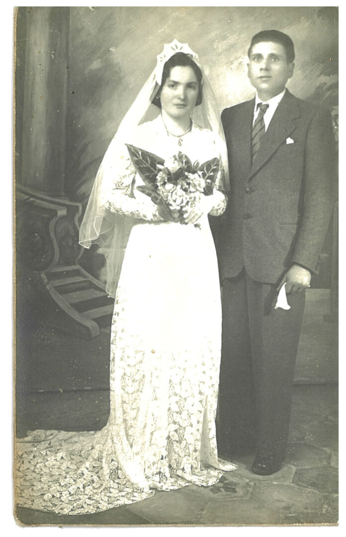 Il nostro protagonista Nicandro D’Acunto ferito a una gamba, resta in acqua per 18 ore prima di essere recuperato e portato prigioniero in Egitto e da qui trasferito in India e infine in Inghilterra. Tornerà in Italia nel maggio 1946. Non trova la sua sposa ad attenderla con il figlio nato. L’Italia in guerra aveva subito lutti per denutrizione e assenza di medicinali. Nel 1941 era morto il bambino e l’anno successivo muore Amelia. Nicandro è profondamente legato alla famiglia Conte e rivolge le sue attenzioni, ricambiato, ad Elvira, la sorella più piccola della sua Amelia. Le due sorelle erano figlie di mamma Filippa componente a sua volta di una famiglia di otto tra fratelli e sorelle. Si sposano il 12 gennaio 1947, lei ventitreenne. Nell’immagine che pubblichiamo appaiano nella foto da studio che si usava realizzare nel dopoguerra. Lei appare di una bellezza fiera, un volto sereno, un abito estremamente elegante, frutto certamente di indubbi sacrifici.