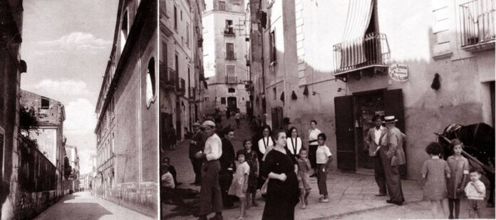 Nelle immagini la via Lavanga quando era ancora via Tullia vista da piazza Guglielmo Marconi (1910) e dal Largo Paone (1937).