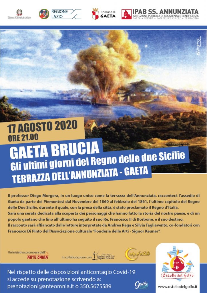 Lunedì 17 agosto, inizio ore 21.00, avrà luogo lo storytelling “Gaeta brucia: gli ultimi giorni del Regno Delle Due Sicilie”, presso l’Istituto della Santissima Annunziata.