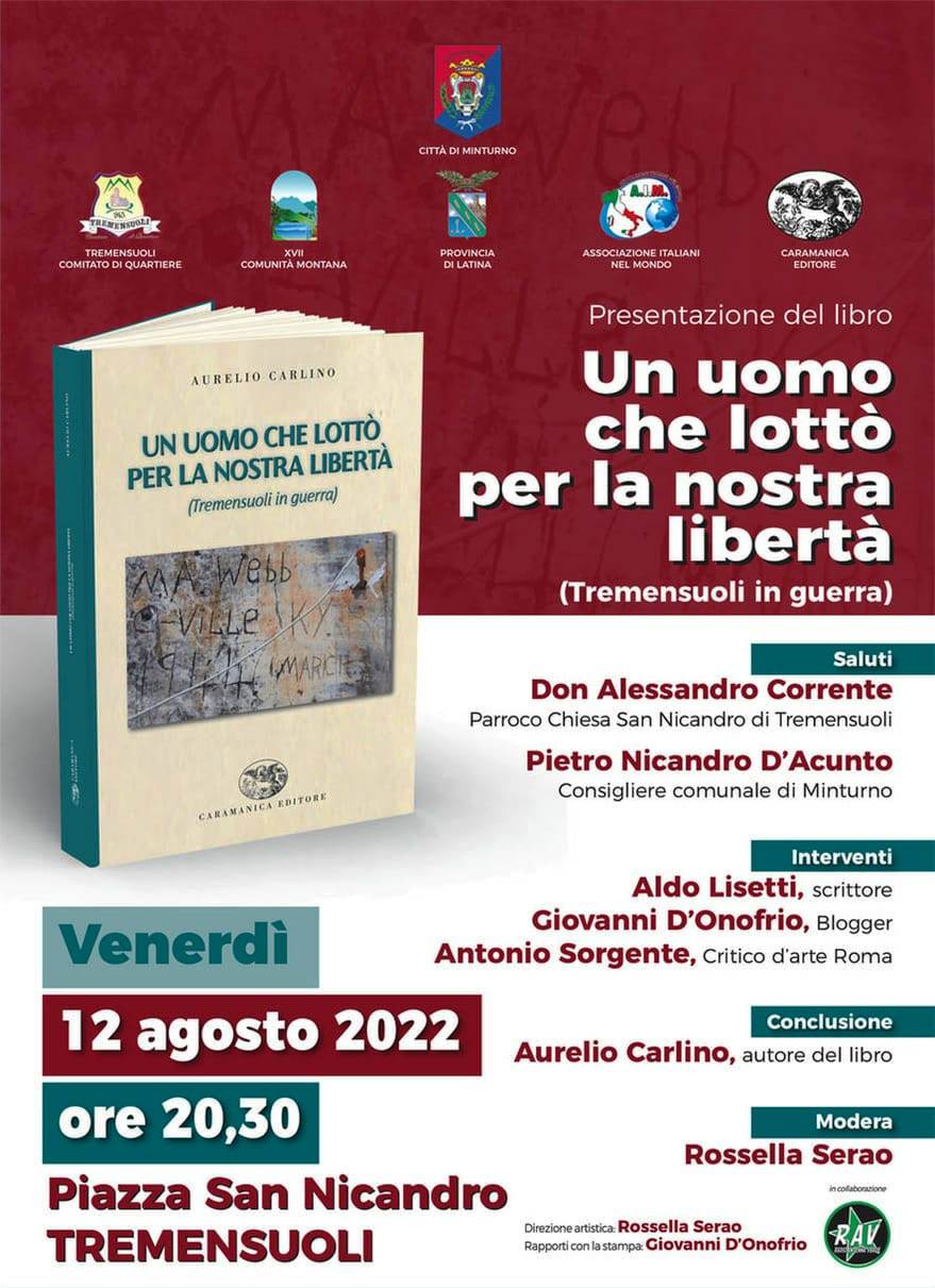 “Un uomo che lottò per la nostra libertà (Tremensuoli in guerra)” è il titolo del nuovo libro di Aurelio Carlino, edito da Armando Caramanica che sarà presentato venerdì 12 agosto 2022, alle ore 20:00, in Piazza Capo Trivio a Tremensuoli di Minturno (Latina). L’autore Aurelio Carlino, scrittore sensibile ed accorto, propone all’attenzione dei lettori il conflitto con una chiave di lettura che non è solo di allarme, ma anche di speranza e di solidarietà umana. Carlino ha pubblicato numerosi volumi, tra gli altri, nel 2013, “Tremensuoli – Amore di una Terra. Storia – Fede – Costumi” (Caramanica Editore) per testimoniare il suo attaccamento a Tremensuoli; è collaboratore di numerose riviste periodiche. Il volume esamina la biografia del soldato Marshall A. Webb del Kentucky, inquadrato nel 339° Reggimento di Fanteria della 5ª Armata degli U.S.A. Questi, nel marzo 1944 venne in Italia e partecipò alle battaglie delle truppe anglo-americane per lo sfondamento del forte schieramento di resistenza dell’esercito germanico: la famigerata linea “Gustav”; dopo nove mesi di duri e cruenti combattimenti giunse, l’11 marzo 1944 a Tremensuoli ed entrò in paese tra i liberatori.
