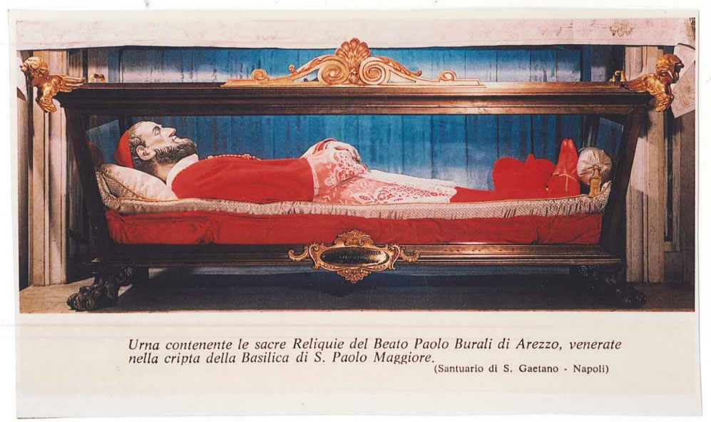 Il corpo del Principe della Chiesa, dopo le esequie celebrate nella cattedrale, fu portato, con immenso concorso di popolo, nella chiesa di S. Paolo Maggiore, dove, nel cimitero dei Padri Teatini, vestito dei suoi paramenti cardinalizi, gli fu data umile sepoltura. “Un intero popolo, come dice il biografo Niccolò Morelli, formò l’elogio dell’Arcivescovo Burali d’Arezzo, e tutte le autorità della Chiesa e dello Stato piansero la perdita di un uomo destinato alla gloria delola Filosofia, al vantaggio dei Popoli, al decoro della Religione”.
