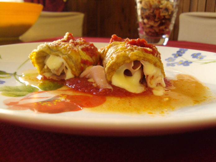 Adagiamo del sugo nella base della pirofila in ceramica e iniziamo a preparare gli involtini. Su ogni singola melanzana fritta adagiamo 1/2 fetta di formaggio a fette e 1/2 fetta di prosciutto cotto, arrotoliamo la melanzana bloccandola con uno stuzzicadenti e la adagiamo nella pirofila. Ripetiamo questa operazione fino a riempire la pirofila di melanzane e ci mettiamo su ancora dell’altro sugo. Grattugiamo sulle melanzane del parmigiano e inforniamo per 10 minuti a 180°. Una volta pronte le melanzane le impattiamo ponendo del sugo sulla base di un piatto piano, due involtini di melanzane e una grattugiata di parmigiano.