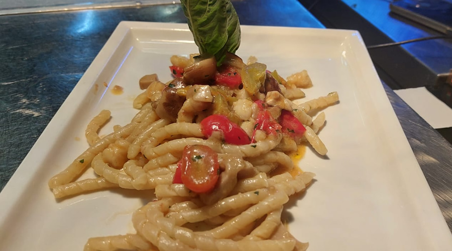 Lo chef Marco Bisleti oggi propone un piatto tipico del suo ristorante: La busiata con rana pescatrice e funghi porcini Un ottimo abbinamento di due prodotti mare e terra. Ingredienti per 4 persone: 500 gr di busiata, una pasta tipica siciliana chiamata comunemente fusillo al ferretto per la sua forma attorcigliata; 400 gr di funghi porcini; uno spicchio di aglio; 20 cl di olio extravergine; 6 pomodorini ciliegino; prezzemolo q.b. Cuocere la pasta nel frattempo, mettere in una padella spicchiò di aglio e olio, fare soffriggere e aggiungere la rana pescatrice tagliata a piccoli cubetti. Lasciare rosolare per 2 minuti circa poi aggiungere i pomodori tagliati in 4 parti.