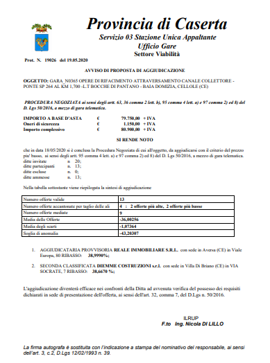 In effetti, la gara d’appalto relativa alle “Opere di rifacimento attraversamento canale collettore – ponte SP264 al km 1,700” è stata aperta il 24 aprile ed è stata chiusa il 15 maggio, con una base d’asta pari a €80.900,00. All’esito della procedura, comunicato il 19 maggio, è risultata aggiudicataria una ditta di Aversa, a fronte di 13 offerte presentate.