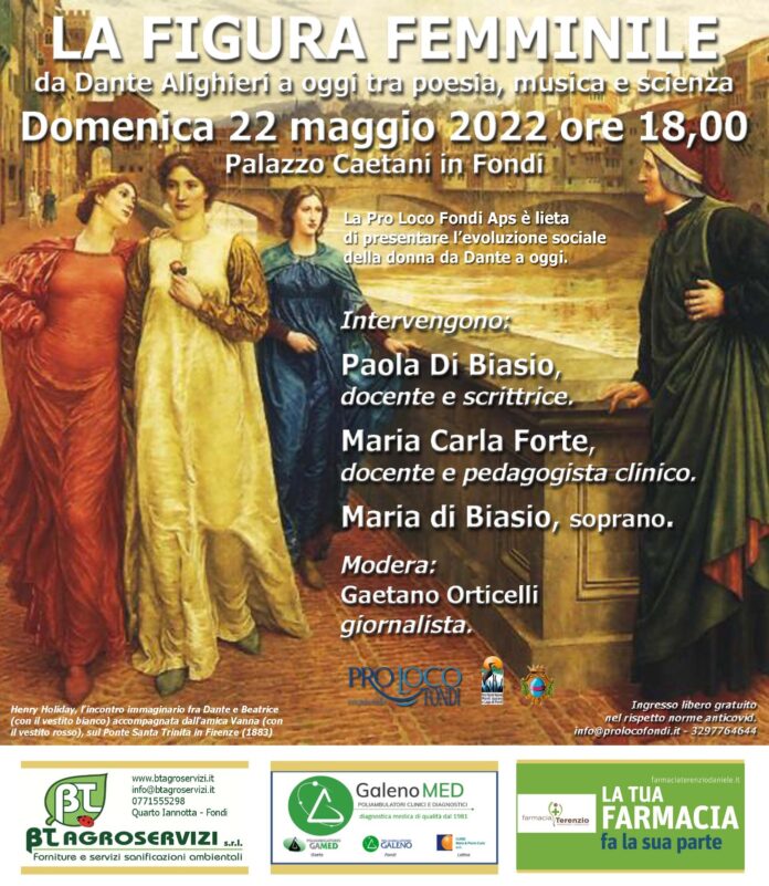 La Pro Loco di Fondi ha promosso per domenica 22 maggio con inizio alle ore 18.00 un evento nel Palazzo Caetani sulla Figura Femminile da Dante Alighieri a oggi tra poesia, musica e scienza. Intervengono tre donne di spessore: Paola Di Biasio docente e scrittrice, Maria Carla Forte docente e pedagogista clinico, Maria Di Biasio soprano. Modera il giornalista Gaetano Orticelli. Un appuntamento da non mancare per coloro che desiderano conoscere il pensiero dell’altra metà del cielo sulla faticosa e laboriosa loro emancipazione.