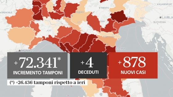 Calano i contagi per il Covid in Italia: sono 878 (contro i 953 di ieri) i nuovi casi registrati nelle ultime 24 ore e resi noti nel bollettino quotidiano del Ministero della Salute.
