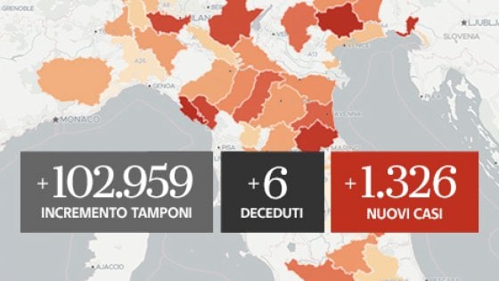 Processati quasi centotremila tamponi: è record. In Sardegna prima vittima della seconda ondata Covid. Il totale delle vittime in Italia sale a 35.497. Il Molise è la sola regione senza nuovi contagi. Sale ancora il numero dei pazienti in terapia intensiva: sono 109, due in più di ieri. Anche Silvio Berlusconi positivo, insieme ai figli Luigi e Barbara.
