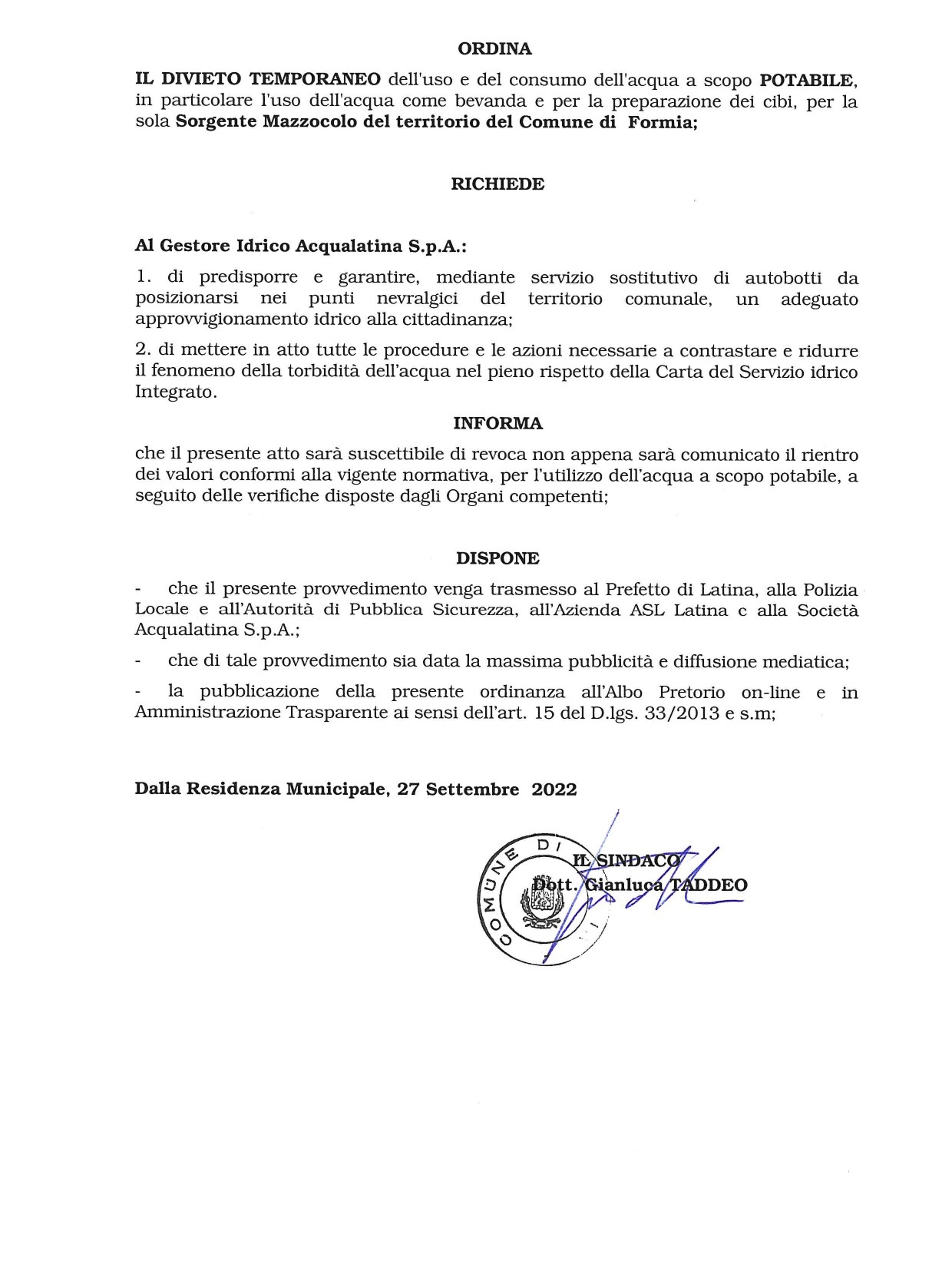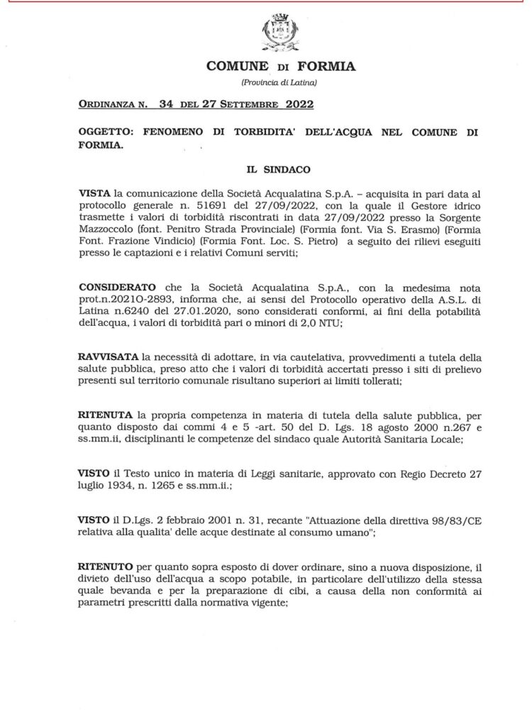 Il Comune di Formia, con l’ordinanza n.34 emessa il 27 settembre 2022, comunica che la Sorgente Mazzoccolo presenta fenomeni di torbidità dell’acqua causati dalle forti piogge e dunque fino a nuova disposizione, invita i cittadini ad astenersi dall’uso e consumo dell’acqua a scopo Potabile. Inoltre richiede al gestore idrico Acqualatina S.p.A. di porre in atto tutte le procedure e le azioni necessarie per contrastare e ridurre tale fenomeno come quanto previsto dalla Carta del Servizio Idrico Integrato.