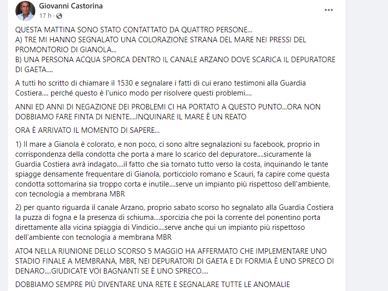 1) Il mare a Gianola è colorato, e non poco, ci sono altre segnalazioni su facebook, proprio in corrispondenza della condotta che porta a mare lo scarico del depuratore….sicuramente la Guardia Costiera avrà indagato….il fatto che sia tornato tutto verso la costa, inquinando le tante spiagge densamente frequentare di Gianola, porticciolo romano e Scauri, fa capire come questa condotta sottomarina sia troppo corta e inutile….serve un impianto più rispettoso dell’ambiente, con tecnologia a membrana MBR