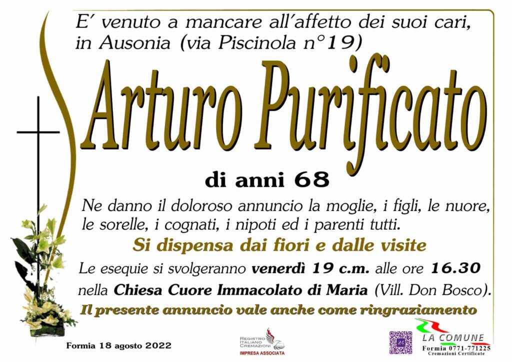 L’ASD SS Calcio Formia, la sua società sportiva di appartenenza, ha dichiarato: “Purtroppo oggi ci ha lasciato il nostro Arturo Purificato. Non ci sono parole per descrivere il dolore che proviamo per la triste notizia. Il dispiacere per la tua perdita è enorme, lasci un grande vuoto come amico e come pilastro della società . Grazie di tutto quello che hai fatto, il tuo amore per il calcio era grandissimo e lo hai dimostrato in tutti questi anni. Un grazie veramente speciale e sincero da parte del presidente Roberto De Marco per aver creduto in lui e avergli passato le redini della società con piena fiducia. Ci mancherai in ogni partita , in ogni goal , in ogni esultanza, ma sarai sempre lì con noi. Ciao Arturo , Ciao Presidè”. L’ASD Scauri Marina Calcio con il suo presidente Luigi Forte e il suo direttore sportivo Michele Treglia hanno voluto esprimere tutto il cordoglio del mondo sportivo scaurese.