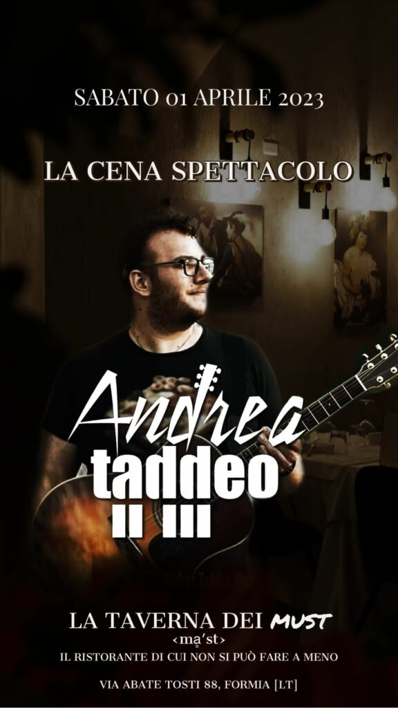 Formia, Cena Spettacolo: sabato 1 aprile presso la Taverna dei Must – Sabato primo aprile l’ormai noto ristorante Taverna dei Must di Formia, situato nella suggestiva via Abate Tosti, 88, ospiterà il musicista Andrea Taddeo. L’artista accompagnerà piacevolmente i piatti proposti dallo Chef Dario Brodella. Una cucina tradizionale che sorprende per il gusto autentico e allo stesso tempo originale. Lo Chef Brodella, proveniente dalla Toffini Academy di Napoli, ha voluto interpretare i piatti della cucina tipica aggiungendo il suo tocco per renderli dei veri e propri copolavori o “must” del gusto. Di seguito la locandina dell’evento: