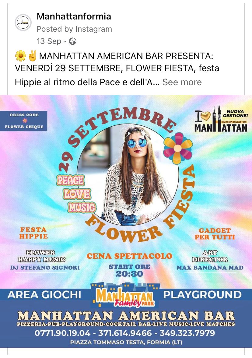 Dagli organizzatori l’annunzio: “Finalmente ci siamo ed è iniziato il conto alla rovescia, venerdì 29 settembre una data da ricordare, flower Fiesta al Manhattan a Formia la festa hippie più bella di sempre, cena spettacolo con dj set Stefano Signori, gadget per tutti i partecipanti e parrucche e occhialoni da provare e un fotografo a vostra disposizione per farvi due Selfie in compagnia di uno staff e coreografia a tema per rendere una serata unica e indimenticabile, ci sono ancora posti disponibili per la cena, musica 70, 80 90 fino ai nostri giorni, potrete grazie al play ground messo a disposizione dal Manhattan, quindi voi genitori potete lasciare tranquillamente i vostri piccoli e divertirvi con noi, e poi tante altre sorprese che se le diciamo che gusto c’è? affrettatevi a prenotare il numero per le prenotazioni e info e 349.3237979 max bandana buona giornata a tutto il gruppo