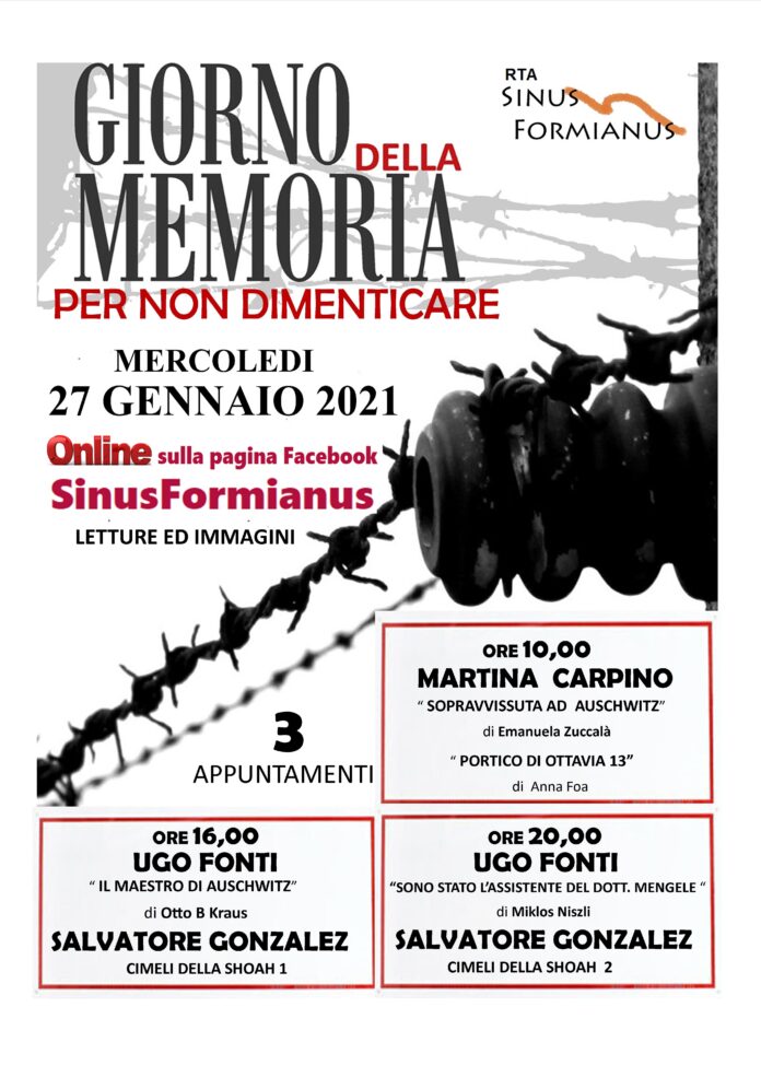 Il 27 Gennaio di ogni anno è un giorno da non dimenticare mai.L’Italia con una legge del 2000 ha scelto questa data perchè il 27 gennaio 1945 fu liberato ad Auschwitz uno dei più terribili campi di concentramento. Nel campo fu trovata una pietra anonima dove un prigioniero con un chiodo aveva scritto”Chi saprà mai quello che mi è capitato qui?” – Sinus Formianus vuole dare il suo contributo per non dimenticare con tre piccoli appuntamenti durante la giornata,on line sulla pagina Facebook SinusFormianus.Tre contributi video fruibili da tutti,in 3 orari differenti.