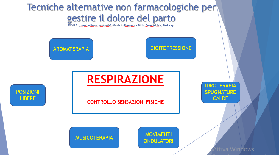 Esistono varie metodiche di controllo del dolore, sia di tipo farmacologico che di tipo non farmacologico. Nel primo caso si parla di parto analgesia (con l’epidurale) o di iniezione di farmaci mentre, le metodiche non farmacologiche di sostegno e controllo del dolore riguardano il supporto emotivo strutturato da parte dell’ostetrica durante il travaglio-parto, la scelta del movimento e della posizioni, l’utilizzo dell’acqua calda che favorisce il rilassamento muscolare, la respirazione, aromaterapia, la psicofonia , tecnica del pettine e il massaggio in travaglio . In seguito al congresso tenutosi a Ponza le società scientifiche AOGOI E SIGO ritengono opportuno fornire a tutte le donne le metodiche non farmacologiche al contenimento del dolore durante il travaglio di parto, come metodi principali per poter contenere il dolore durante un momento delicato della vita di una donna.