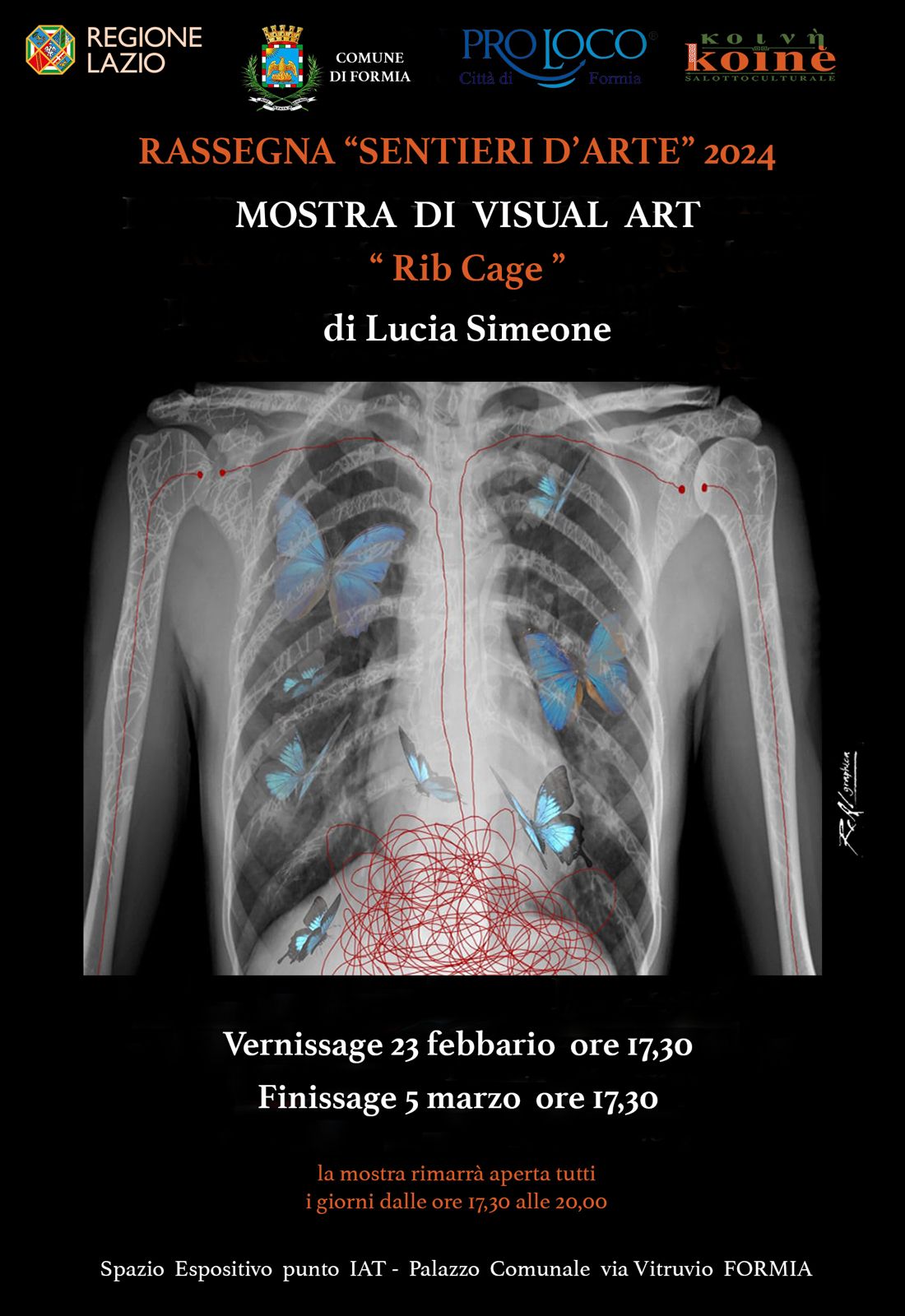 Visual Art – Per la Rassegna Sentieri d’Arte 2024, è iniziata ieri la mostra di Visual Art “Rib Cage” di Lucia Simeone. La mostra rimarrà aperta dalle ore 17,30 alle ore 20,00, tutti i giorni, fino al 5 marzo nello spazio espositivo punto IAT – Palazzo Comunale – Via Vitruvio in Formia. L’evento è patrocinato dalla Regione Lazio, dal Comune di Formia, dalla Pro Loco e dal Salotto culturale KOINE’. E’ un viaggio nelle profondità dell’anima attraverso la complessità dell’esperienza umana. Psiche, soma e arte si fondono in un’ unica entità.
