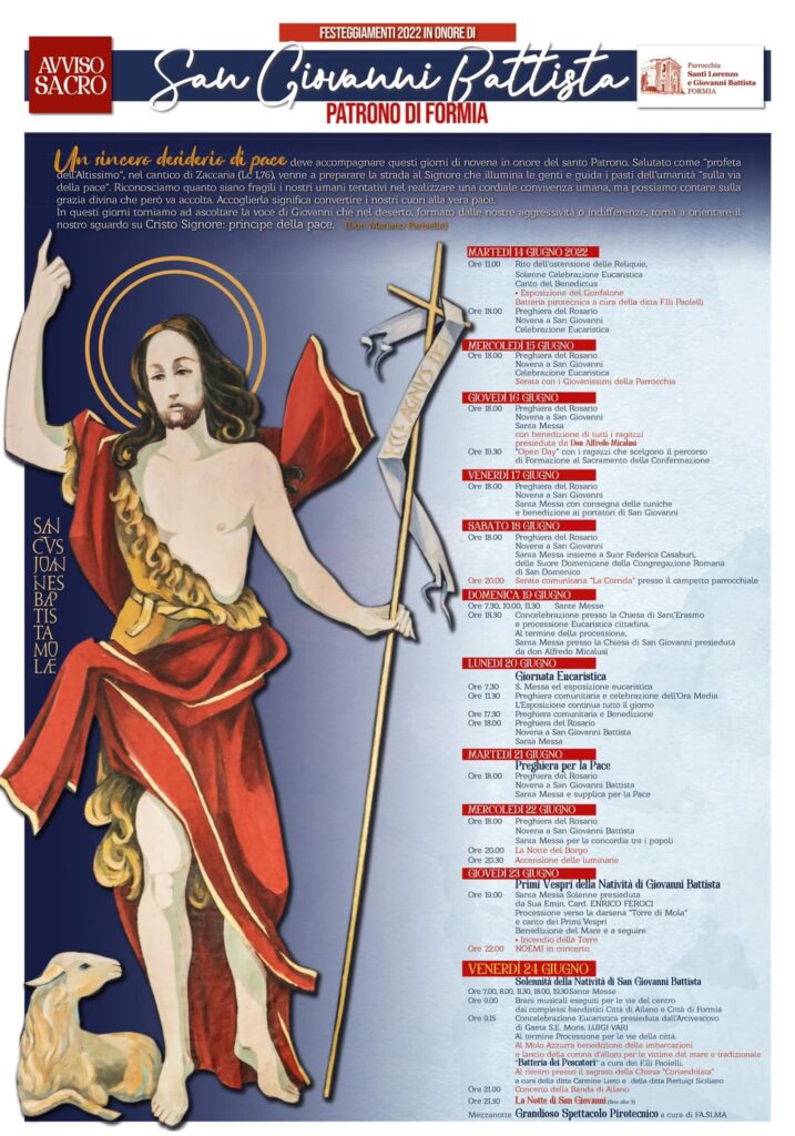 Formia, San Giovanni: Il programma completo. Noemi in concerto – Il Comitato di Formia per i festeggiamenti in onore di San Giovanni Battista in una nota stampa comunica: “Di seguito il programma completo dei Festeggiamenti 2022 in onore di San Giovanni Battista. Il tempo è stato pochissimo ma nonostante tutto abbiamo fatto il massimo e continueremo a farlo per portare a compimento il nostro lavoro. Buona festa a tutti!”