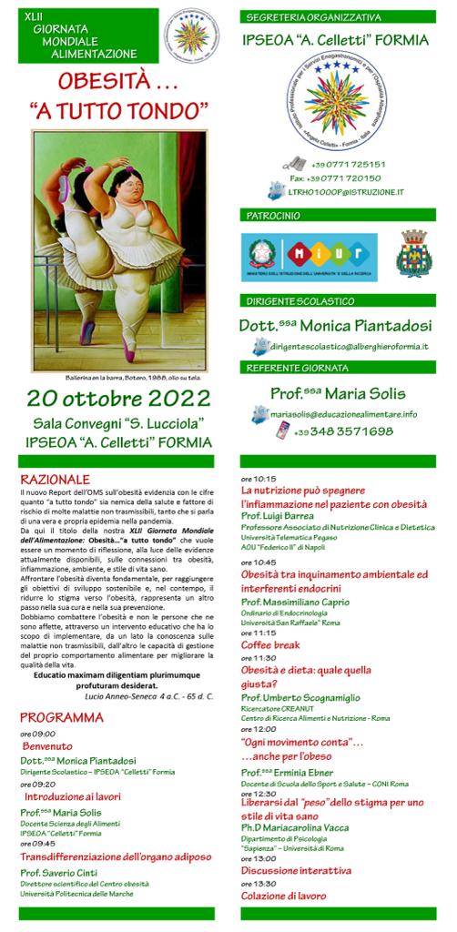 Formia: XLII Giornata Mondiale dell’Alimentazione – Si terrà il 20 ottobre, nella Sala Convegni dell’Ipseoa “Celletti” di Formia, in occasione della XLII Giornata Mondiale dell’Alimentazione, il tradizionale convegno dal titolo: “Obesità… “a tutto tondo””, che vuole essere un momento di riflessione, alla luce delle evidenze attualmente disponibili, sulle connessioni tra obesità, infiammazione, ambiente e stile di vita sano.Diversi gli interventi in aula nel corso della mattinata e i relatori che sì alterneranno per offrire il proprio contributo:Prof. Saverio Cinti – Candidato al Premio Nobel anno 2018 – Direttore scientifico del Centro obesità dell’Università Polite mica delle MarcheProf. Luigi Barrea – Professore Associato di Nutrizione Clinica e Dietetica dell’Università Telematica Pegaso – AOU “Federico II” di NapoliProf. Massimiliano Caprio – Ordinario di Endocrinologia dell’ Università San Raffaele di RomaProf. Umberto Scognamiglio – Ricercatore CREANUT Centro di Ricerca Alimenti e Nutrizione di RomaProf.ssa Erminia Ebner – Docente di Scuola dello Sport e di Sport e Salute di RomaPh.D Mariacarolina Vacca – Dipartimenti di Psicologia “Sapienza” Università di RomaAccoglierà tutti i presenti la Dott.ssa Monica Piantadosi, Dirigente scolastico dell’Istituto Alberghiero, introdurrà la giornata la Prof.ssa Maria Solis, Docente di Scienze degli Alimenti dell’IPSEOA di Formia.