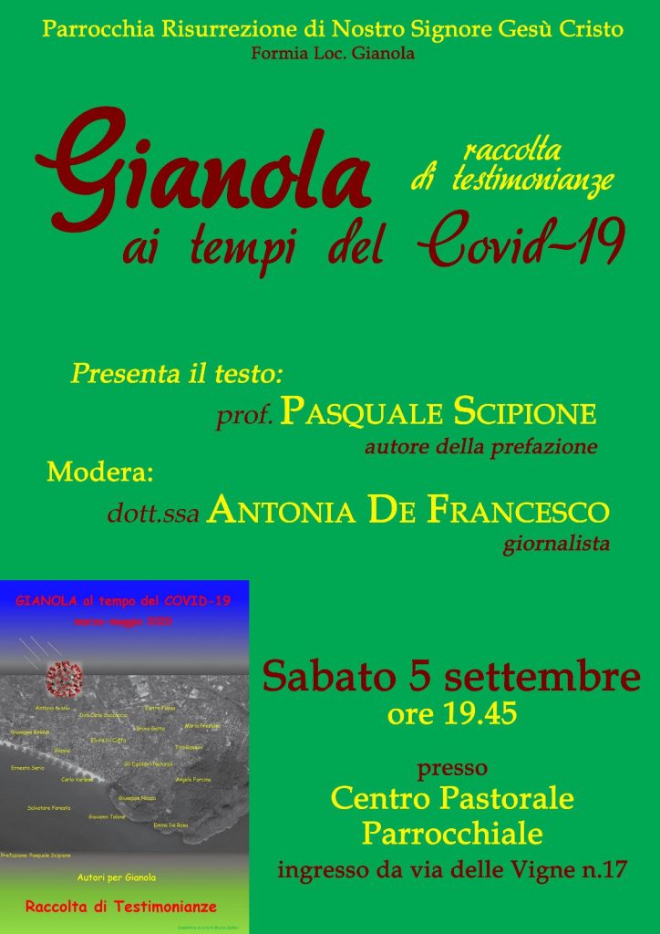 Sabato prossimo 5 settembre, ore 19.45, presso la Tenda dell’Incontro a Gianola viene presentato il libro “Gianola al tempo del Covid19, Marzo – Maggio 2020”, una raccolta di testimonianze. Interviene il professore Pasquale Scipione, modera la dottoressa Antonia De Francesco.