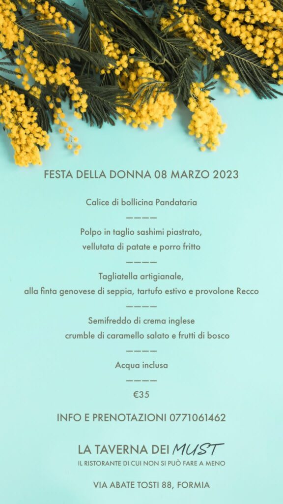 Il menù della Festa della donna proposto dal ristorante La Taverna dei Must a Formia – L’elegante e raffinato ristorante La Taverna dei Must situato a Formia nella suggestiva via Abate Tosti propone un piacevole menù in occasione del giorno 8 marzo, festa della donna. La cena tra le imponenti mura della location con luce soffusa inizia con un calice di bollicine Pandatoria. Segue l’antipasto (polpo in taglio sashimi piastrato, vellutata di patate e porro fritto). Segue il primo piatto (tagliatella artigianale alla finta genovese di seppia, tartufo estivo e provolone Recco). Segue il dolce (semifreddo alla crema inglese con crumble di caramello salato e frutti di bosco). Acqua inclusa. Costo della cena €35. Info e prenotazioni 0771.061462. La Taverna dei Must (Il Ristorante di cui non si può fare a meno) è a Formia in via Abate Tosti, 88.