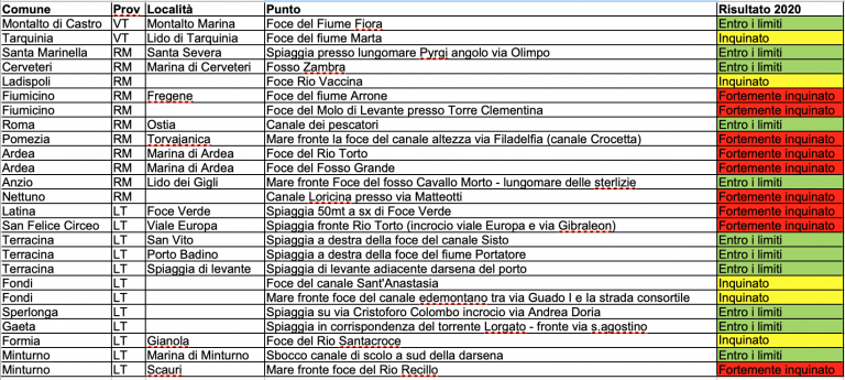In provincia di Viterbo sono stati due i punti sotto i riflettori: entro i limiti il punto sulla foce del fiume Fiora a Montalto di Castro e inquinato il punto sulla foce del Marta a Tarquinia.