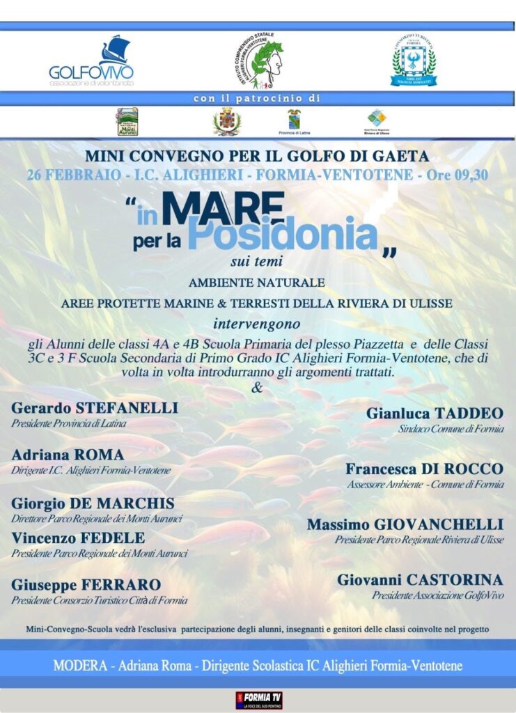 In mare per la Posidonia – Giovedì 26 febbraio alle ore 9:30 presso l’Istituto Comprensivo Alighieri Formia-Ventotene, si terrà un mini convegno per il Golfo di Gaeta sui temi: ambiente naturale, aree protette marine e terrestri della Riviera di Ulisse, alla presenza degli alunni delle classi 4°A e 4°B della Scuola Primaria del plesso Piazzetta e delle classi 3°C e 3°F della Scuola Secondaria di Primo Grado dell’Istituto Comprensivo Alighieri Formia-Ventotene che, di volta in volta, introdurranno gli argomenti trattati. Saranno presenti: il presidente della Provincia di Latina Gerardo Stefanelli; il dirigente dell’Istituto Comprensivo Alighieri Formia Ventotene, Adriana Roma, moderatrice dell’incontro; il direttore del Parco Regionale dei Monti Aurunci, Giorgio De Marchis; il presidente del Parco regionale dei Monti Aurunci, Vincenzo Fedele; il presidente del Consorzio Turistico città di Formia, Giuseppe Ferraro.