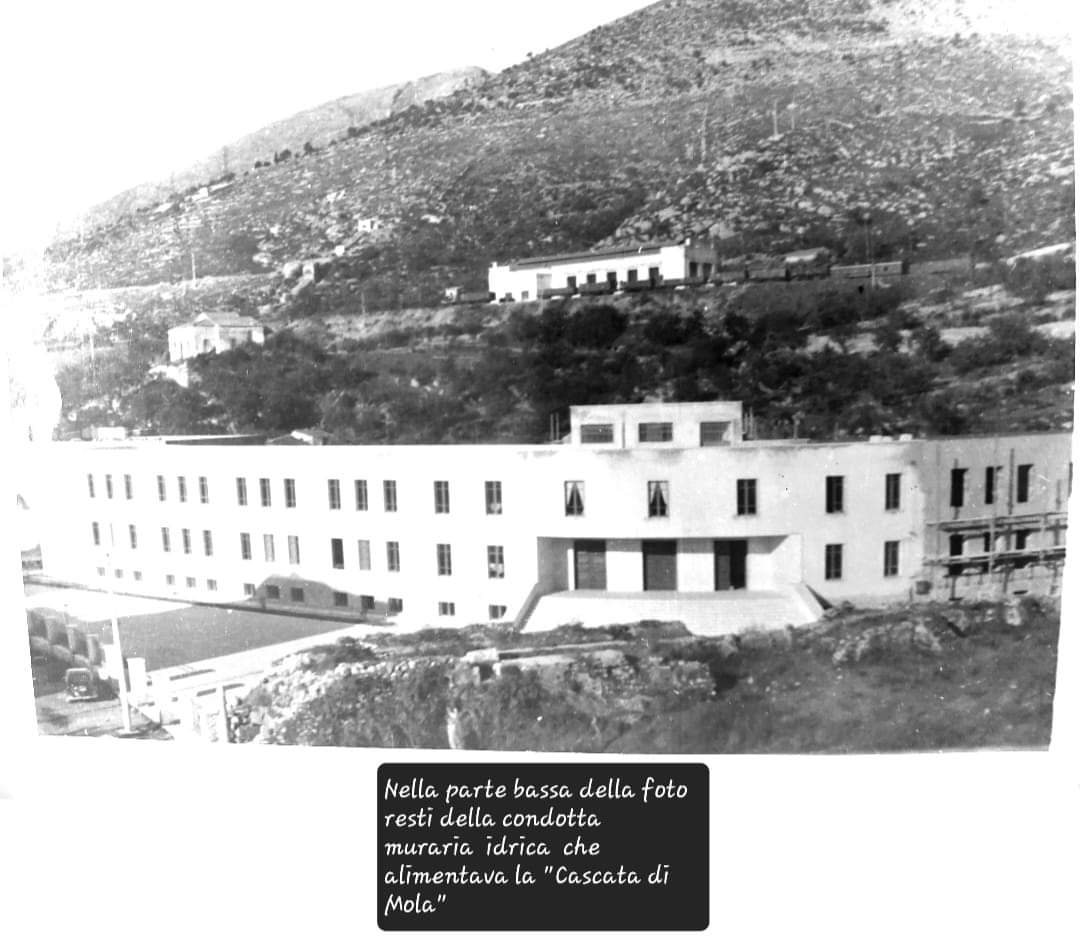 La Cascata di Mola di Formia – Nella foto in basso, che risale ai primi anni del dopoguerra, è ben visibile , in primo piano, l’edificio scolastico ” De Amicis” di Mola , in corso di costruzione. Ma, se vi sforzate a vedere nella parte più bassa della foto, rimarrete stupiti !!! Sembra, a prima vista , un normale muro decrepito , ma non è così.