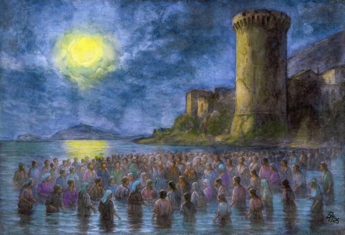 La notte di San Giovanni rappresenta il legame profondo tra l’uomo, la natura e il sacro, unendo antichi riti di fertilità e protezione con la spiritualità cristiana, e continua ancora oggi a essere un momento di festa e di comunità in molte culture italiane ed europee. L’immagine è una mia rappresentazione ad acquerello che raffigura il tradizionale bagno nella notte di San Giovanni nelle acque che circondano la Torre di Mola.