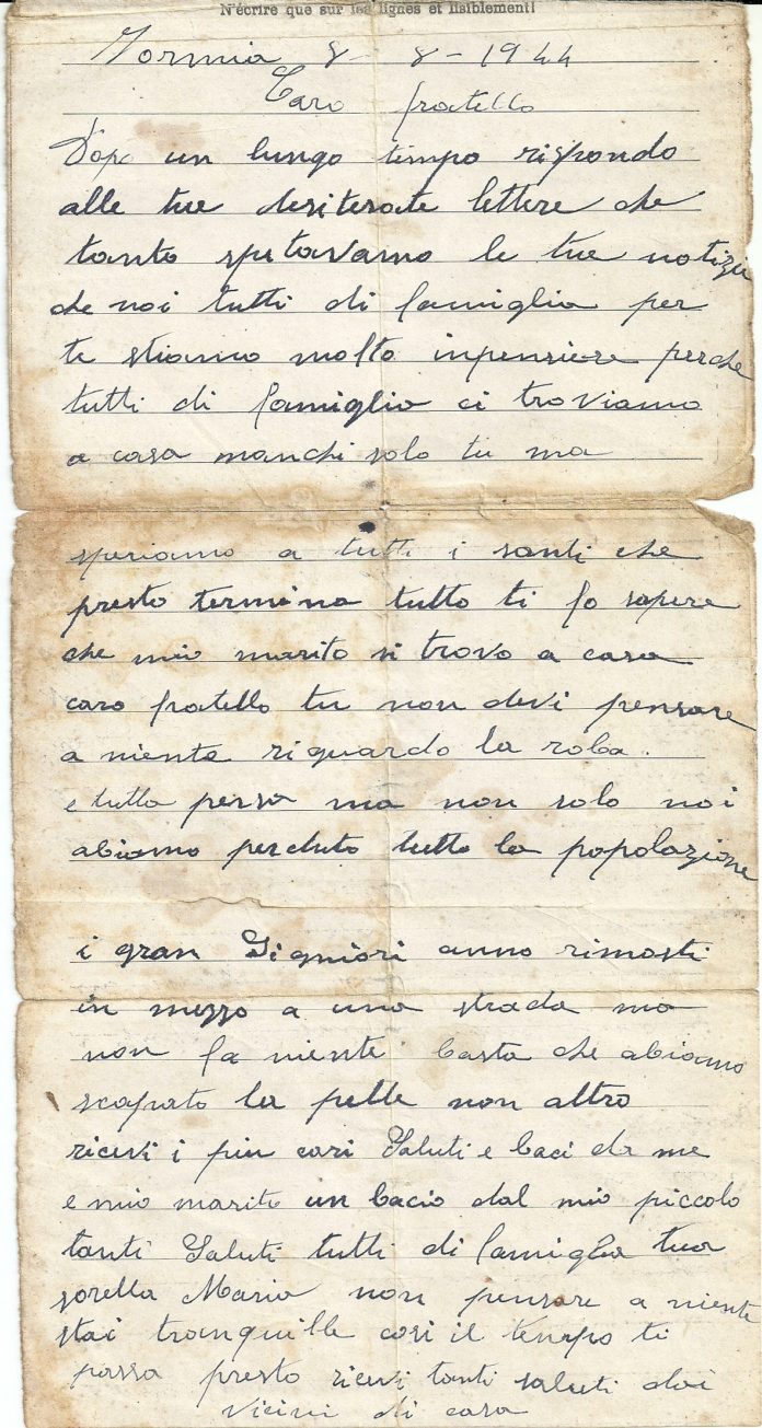 Era un bellissimo giovane, alto, biondo e con lineamenti che facevano sembrare lui stesso un tedesco. La famiglia conserva una lettera che gli scrisse la sorella Maria mentre era prigioniero in Germania, sopportando ogni stento. Una lettera per alcuni versi tragicomica nella quale la sorella lo invita a stare calmo in modo che il tempo gli passa più veloce però gli comunica che non hanno più nulla, la famiglia ha perso tutto e unica consolazione che anche i signori sono in mezzo alla strada. Ci vuole molta fantasia a considerarla una lettera consolatoria, ma appare di più come una lettera di una sorella che per evitare future delusioni del fratello al suo rientro in patria gli presenta subito lo stato della popolazione civile formiana. Non vi è più nulla, né per i signori né per gli operai e i contadini.
