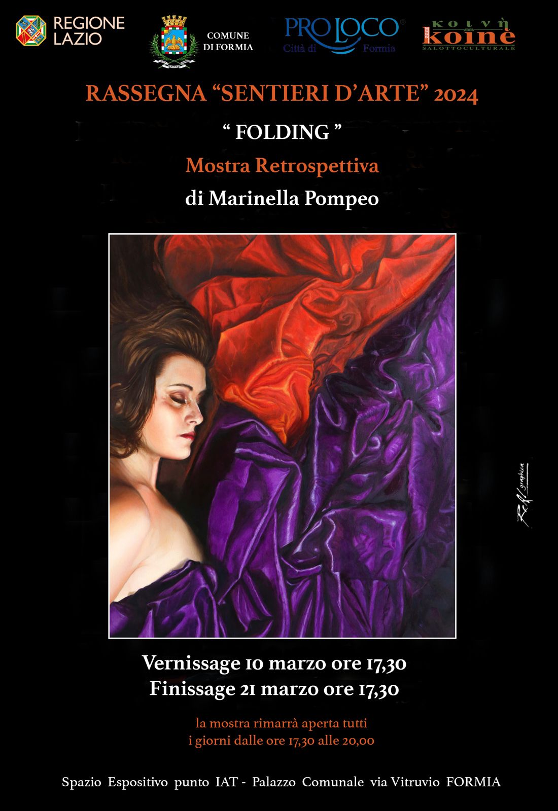 Formia: Mostra retrospettiva di Marinella Pompeo: dal 10 al 21 Marzo – L’evento è il quinto inserito nella rassegna “Sentieri d’Arte 2024”, promossa dall’associazione culturale Koiné in collaborazione con l’Ufficio informazioni e accoglienza turistica e l’Assessorato alla Cultura e al Turismo del Comune di Formia. Il Vernissage è previsto per le ore 17:30 del 10 marzo, il finissage per la stessa ora del 21 marzo. La mostra retrospettiva di Marinella Pompeo, intitolata “FOLDING”, rappresenta un’opportunità unica per immergersi nell’universo artistico di un talento poliedrico e appassionato.