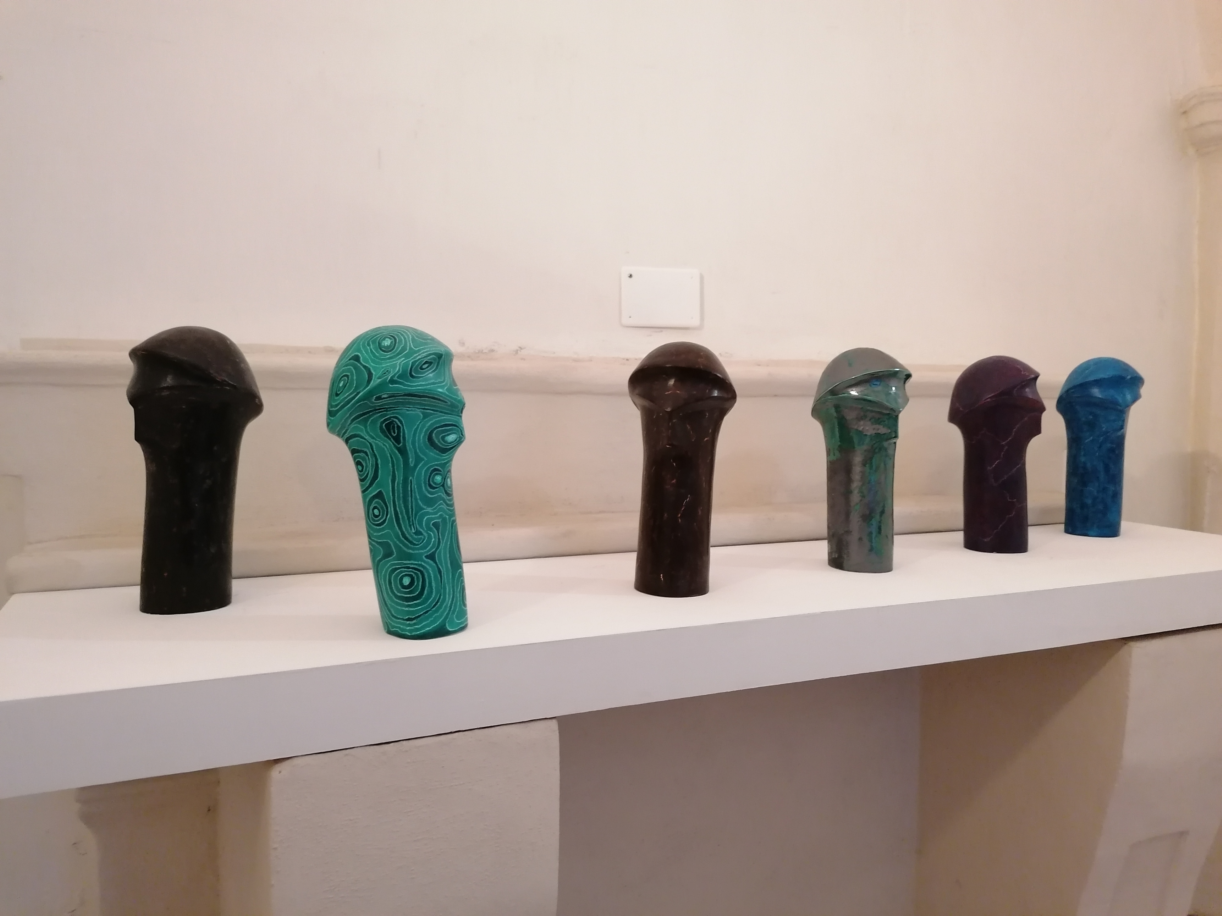 Il percorso inizia con una serie di sei teste “sentinella” in terracotta dipinta, poste sull’altare nella Cappella di San Michele, il santo-guerriero. Procedendo sulla sinistra ed entrando nelle cucine si trovano tre mezzi busti bianchi: “i-mago” e “ypnea”, in terracotta, “elisa” in cemento armato, le sacerdotesse del fuoco. Attraversando il terrazzo ed entrando nella mole del Mastio, cinque figure femminili, verticali, in gesso armato, bianche, le “ninfe dell’acqua”, si offrono come continuità tra tempo e spazio, con le loro forme sinuose.