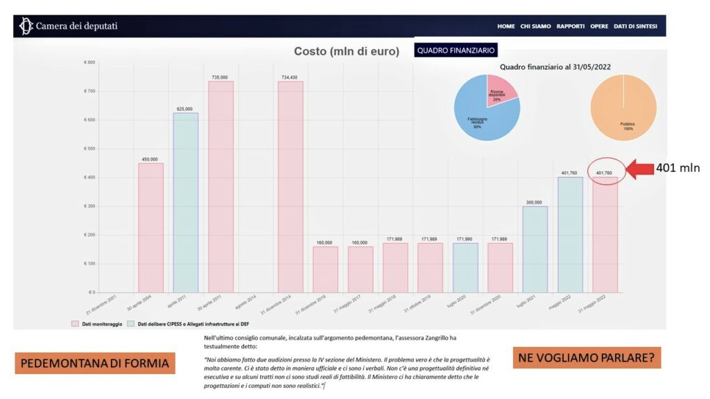 Pedemontana impossibile? grosse problematiche dell’ultimo progetto ANAS. Ecco il fabbisogno stimato – “Le dichiarazioni dell’Assessora Eleonora Zangrillo, in riferimento a quanto espresso dal Ministero dei Lavori Pubblici, confermano le grosse problematiche dell’ultimo progetto ANAS per la cosiddetta Pedemontana, ora chiamata tangenziale di Formia. Si tratta di problemi che, via, via negli anni, stanno dimostrando l’insostenibilità del progetto: zone di attraversamento densamente abitate e soggette a rischio idrogeologico, costi esorbitanti, interferenze con il bacino di alimentazione delle sorgenti, sia nella fase di costruzione che di esercizio. Questi problemi allungano i tempi e le concrete possibilità di attuazione dell’opera.