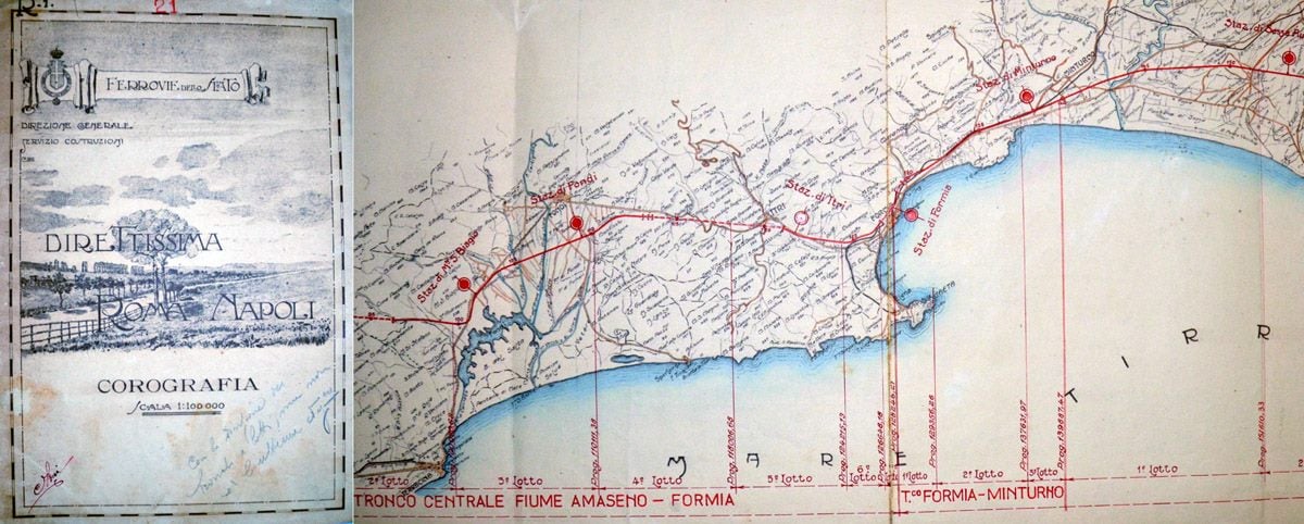 Storia della Stazione Ferroviaria di Formia – Quando il 3 maggio 1892 entrò in funzione la Stazione Ferroviaria di Formia, sulla linea Gaeta-Formia-Sparanise, nessuno avrebbe mai immaginato quale importante futuro era destinato a questo piccolo scalo ferroviario con solo due binari. Il 16 luglio 1922, veniva inaugurato il primo tronco ferroviario da Roma a Formia sulla “Direttissima Roma-Napoli”, e la rinnovata Stazione Ferroviaria di Formia divenne una delle più importanti opere portate a termine dal regime fascista tra il Lazio e la Campania. Da tempo si parlava di una nuova linea ferroviaria che collegasse Roma a Napoli in breve tempo, in alternativa alla lenta Roma-Segni-Cassino-Napoli, già in funzione dal 1863 e che aveva interessato tre differenti amministrazioni statali: la Monarchia Borbonica, il neonato Regno d’Italia e lo Stato Pontificio. Il primo progetto della Direttissima porta la data dell’anno 1871, ma soltanto nel 1907, con apposita legge sulla progettazione di nuove ferrovie, fu affidata all’Amministrazione delle Ferrovie dello Stato la costruzione della Direttissima.