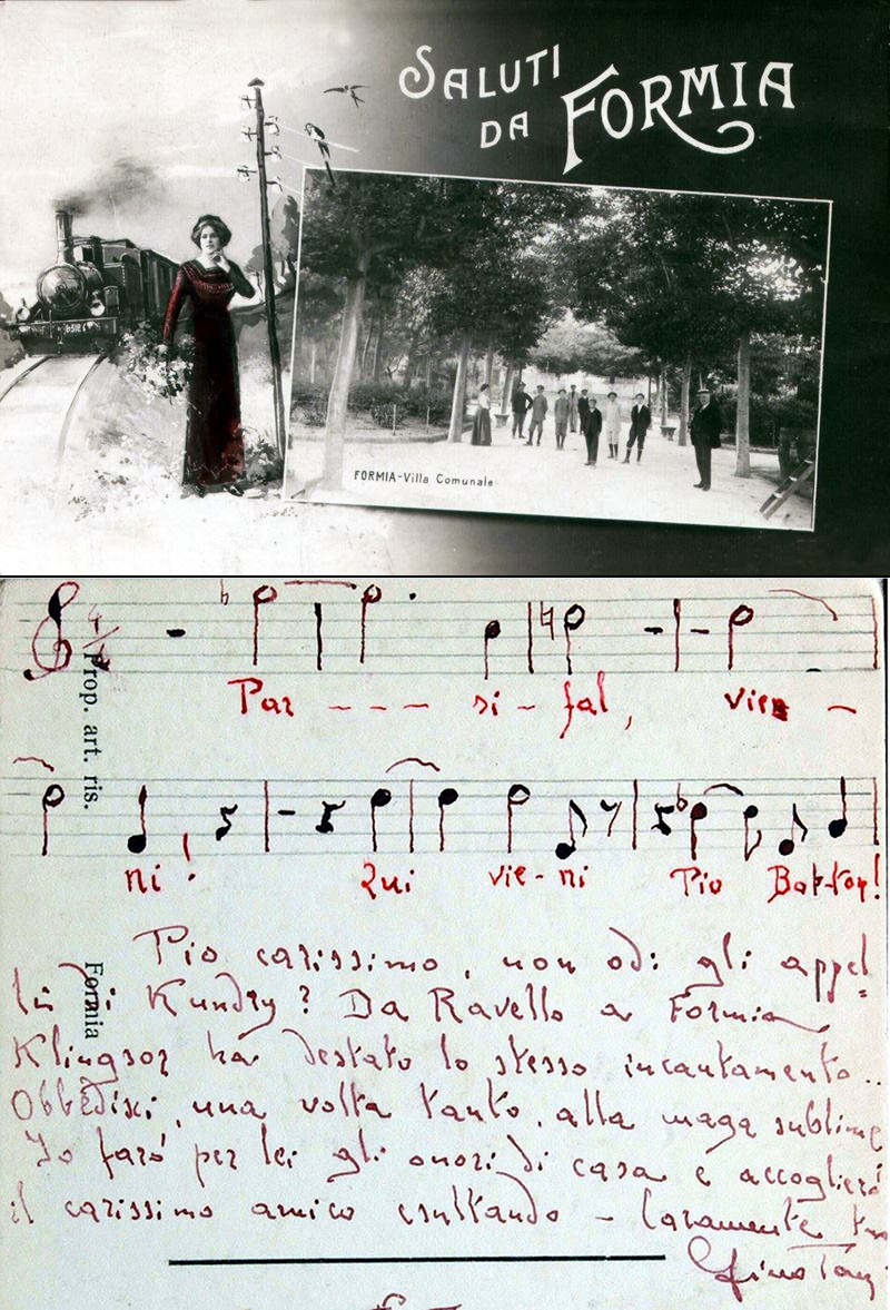 “Pio carissimo, non odi gli appelli di Kundry? Da Ravello a Formia, Klinksor ha destato lo stesso incantamento… Obbedisci, una volta tanto, alla maga sublime. Io farò per lei gli onori di casa e accoglierò il carissimo amico esultando. Caramente tuo Gino Tani.”Il musicale invito rivolto da Gino Tani ( Tivoli 1901 – Roma 1987), docente di storia della musica e della danza a Roma, presso il conservatorio di S. Cecilia di Roma, era rivolto al prof. Pio Bottoni (Tivoli 1883 Roma 1936), pittore romano operante nell’ultimo trentennio del XIX secolo, specializzato nella pittura paesaggistica, sia ad olio che ad acquerello, attivo tra Umbria e Lazio. Ma non era passione per la pittura ciò che univa i due amici, bensì l’amore per la musica. Pio Bottoni era anche storico e critico di danza e gran Maestro dell’Ordine Wagneriano. Il professor Gino Tani lo invitava a trascorrere alcuni giorni a Formia, paragonandola allo scenario rappresentato nel secondo atto del Parsifal, opera di Richard Wagner (Lipsia 1813, Venezia 1883), ambientata nel giardino del perfido Klingsor, ispirato al magnifico parco di Villa Rufolo a Ravello, sulla costiera amalfitana, visitata dallo stesso Wagner nel 1880. Nell’immagine La cartolina e l’invito musicale rivolto da Gino Tani all’amico Pio Bottoni.